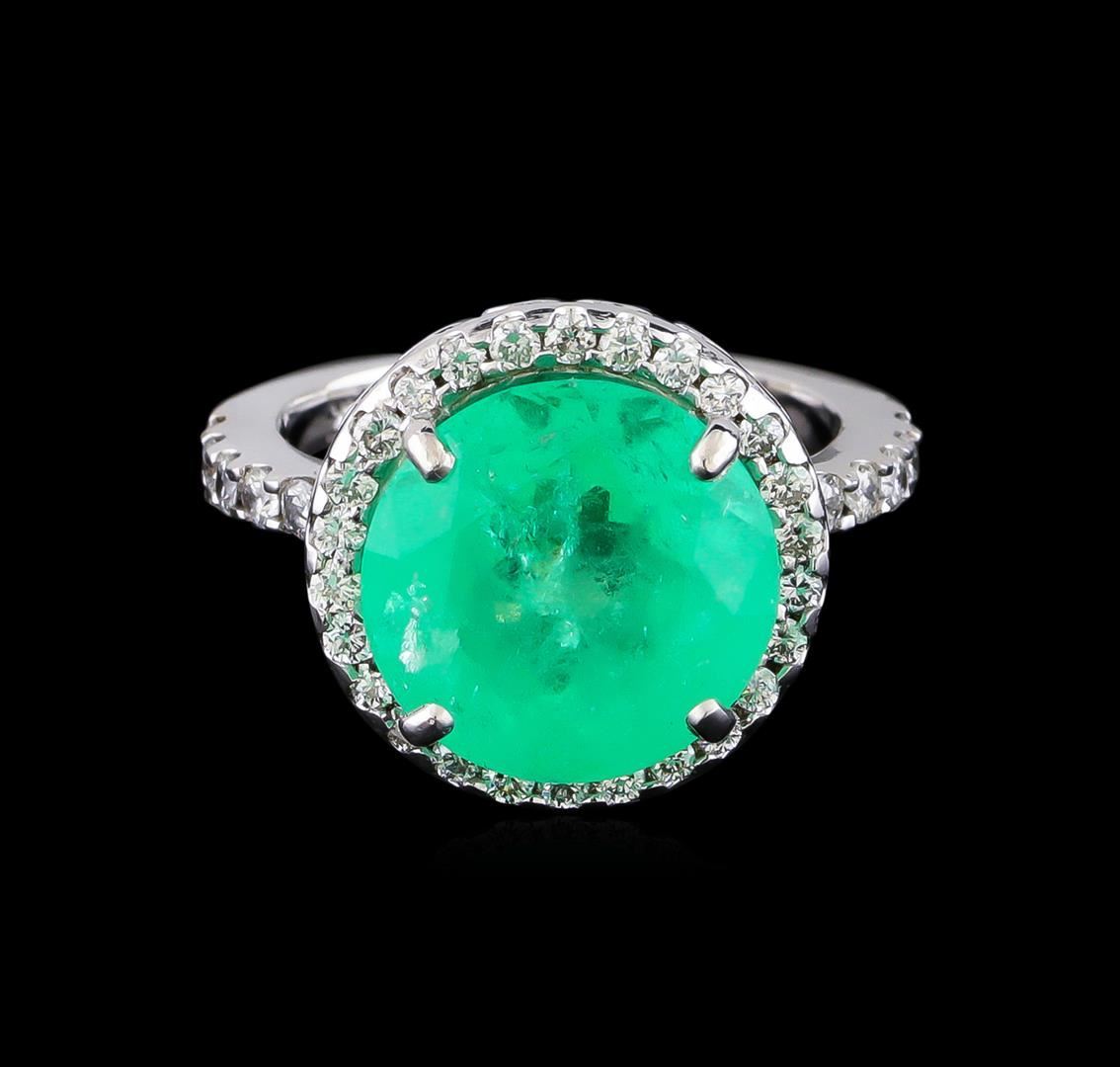 One electronically tested 14KT white gold lady's cast fashion ring with a basket halo with a bright polish finish. The featured lady's ring has a shank measuring 2.0 millimeters in width. Identified with markings of "14K". Condition is new, good workmanship. Containing: One prong set round modified brilliant cut natural emerald, measuring 12.11 - 12.00 x 8.27 mm, (depth est.) 5%. bulge factor, approximate weight of 6.97ct., clarity is heavily included, medium light, moderately strong, green color, (GIA G 4/4), cut is good. Transmitting light somewhat diffusely, transparent to translucent. Colored gemstones are presumed to have been subjected to commonly used enhancement processes. Indications of oil residue. Graded in the setting. Twelve prong set round brilliant cut diamonds, measuring 1.90 - 1.80 x 1.11mm (depth est.) approximate total weight of 12 Stones = 0.30ct. Graded in the setting. Clarity: SI-1 to SI-2. Color: G - Good Twenty-Six prong set round brilliant cut diamonds, measuring 1.60 - 1.50 x 0.95mm (depth est.) approximate total weight of 26 Stones = 0.36ct. Graded in the setting. Clarity: VS to SI-2. Color: G - Good. Total Weight of Colored Stones 6.97ct. Total Weight of Diamonds 0.66ct. Total Weight of Ring 6.70gm GAS Appraised at $13,965.00.