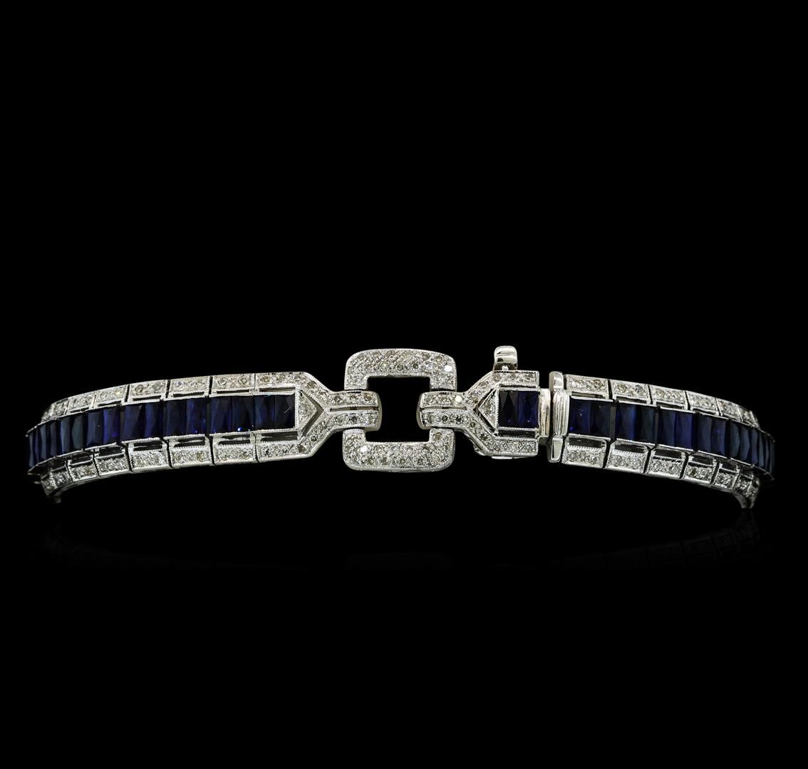 One electronically tested 18KT white gold ladies cast & assembled sapphire and diamond bracelet. Seven inch wearable length bracelet features flexible sapphire ribbons set within diamond bezels supported by diamond set square links, terminating in a concealed clasp with safety. Bright and patterned finish with milgrain detailing. Identified with markings of '750'. Condition is good. Containing: Sixty channel set rectangular mixed cut natural blue sapphires, measuring 3.60 x 2.00 x 1.30mm, approximate total weight of 6.97ct., clarity is eye clean, type II, medium dark, very slightly grayish, blue color, (GIA B 6/3), cut is good. Transmitting light with no distortion, transparent. Measurements & the color grade are an average for the group. Graded in the setting. Two Hundred Eighty-Two prong set single cut diamonds, measuring 1.10 - 1.00 x 0.63mm (depth est.) approximate total weight of 282 Stones = 1.20ct. Graded in the setting. Clarity SI-1 to SI-2. Color: F - H. Total Weight of Colored Stones 6.97ct.. Total Weight of Diamonds 1.20ct.. Total Weight of Bracelet 19.26gm. AIG Appraised at $11,455.00.