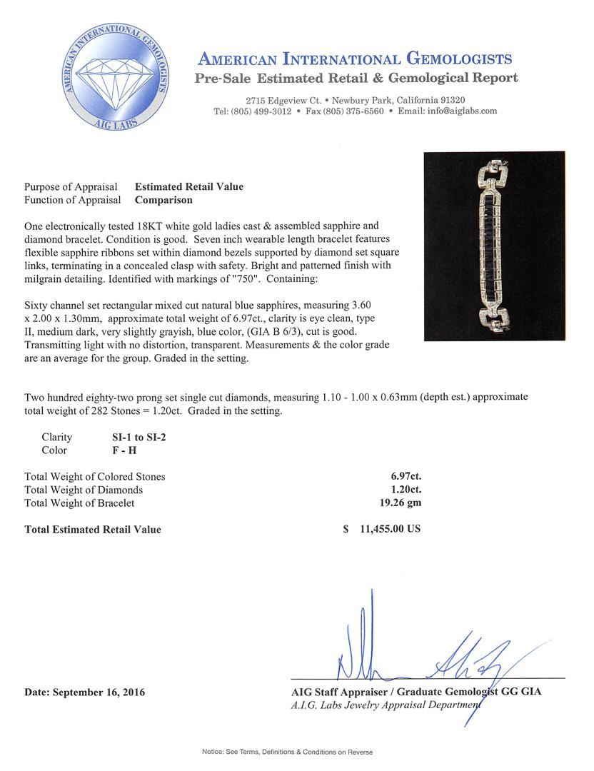 One electronically tested 18KT white gold ladies cast & assembled sapphire and diamond bracelet. Seven inch wearable length bracelet features flexible sapphire ribbons set within diamond bezels supported by diamond set square links, terminating in a concealed clasp with safety. Bright and patterned finish with milgrain detailing. Identified with markings of '750'. Condition is good. Containing: Sixty channel set rectangular mixed cut natural blue sapphires, measuring 3.60 x 2.00 x 1.30mm, approximate total weight of 6.97ct., clarity is eye clean, type II, medium dark, very slightly grayish, blue color, (GIA B 6/3), cut is good. Transmitting light with no distortion, transparent. Measurements & the color grade are an average for the group. Graded in the setting. Two Hundred Eighty-Two prong set single cut diamonds, measuring 1.10 - 1.00 x 0.63mm (depth est.) approximate total weight of 282 Stones = 1.20ct. Graded in the setting. Clarity SI-1 to SI-2. Color: F - H. Total Weight of Colored Stones 6.97ct.. Total Weight of Diamonds 1.20ct.. Total Weight of Bracelet 19.26gm. AIG Appraised at $11,455.00.