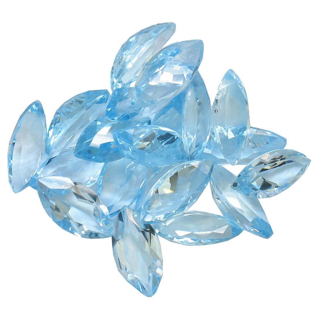 Twenty marquise mixed cut natural blue topazs exact total weight 60.22ct., clarity is eye clean, type I, medium dark, moderately strong, very slightly greenish blue color, (GIA vslgB 6/4), cut is good. Westfield Appraised at $1,160.00.