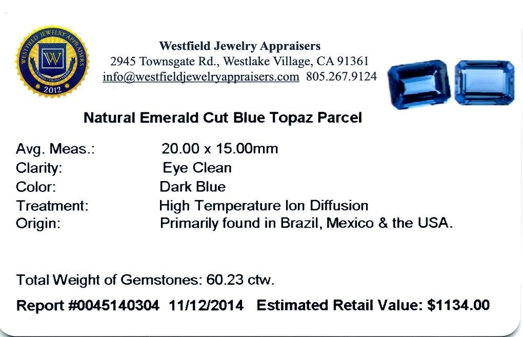 60.23ctw. Natural Emerald Cut Blue Topaz Parcel. Westfield Appraised at $1,134.00.
