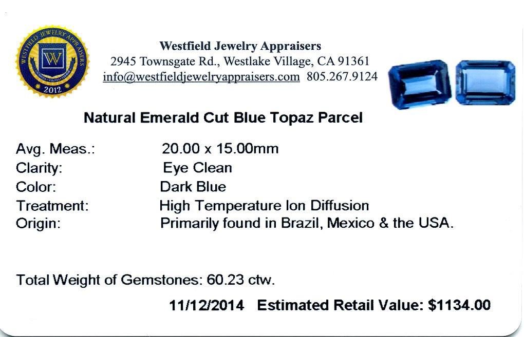 60.23ctw. Natural Emerald Cut Blue Topaz Parcel. Westfield Appraised at $1,134.00.