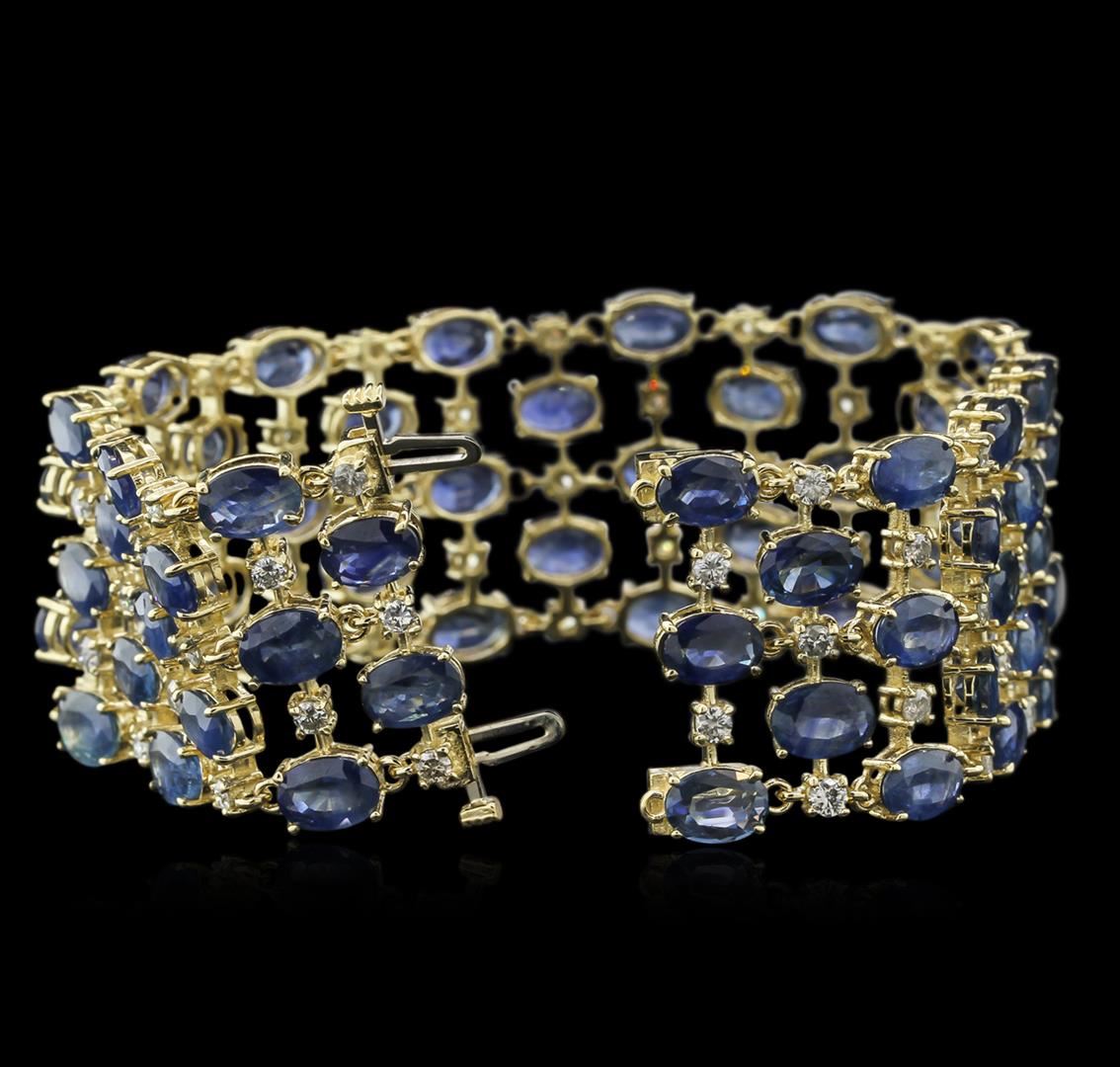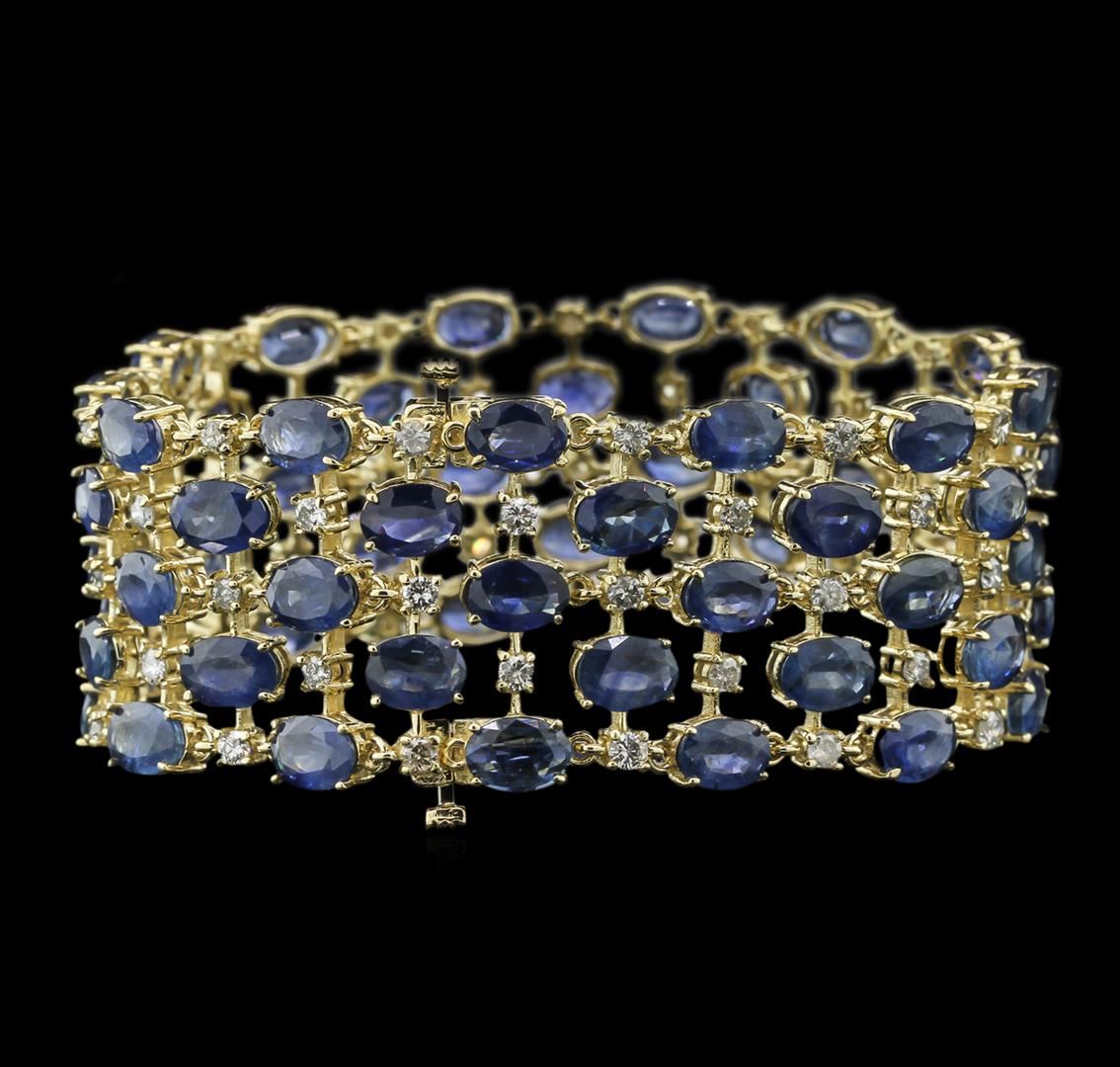 One electronically tested 14KT yellow gold ladies cast sapphire and diamond bracelet with a hidden box clasp with safety closer with a bright polish finish. 7.50" in length Identified with markings of "14K". Condition is new. Containing: Sixty-five prong set oval modified brilliant cut natural blue sapphires, measuring 7.00 x 5.00 x 3.25mm, approximate total weight of 62.40ct., clarity is moderately included, type II, medium light, very slightly grayish, blue color, (GIA B 4/3), cut is good. Sixty-Five prong set round brilliant cut diamonds, measuring 2.50 - 2.50 x 1.50mm (depth est.) approximate total weight of 65 Stones = 3.71ct. Clarity: SI-1 to SI-2. Color: I - J, Cut is Good. Colored gemstones are presumed to have been subjected to commonly used enhancement processes. All diamonds and colored gemstones are graded in the mounting, unless otherwise stated. Total Weight of Colored Stones 62.40ct. Total Weight of Diamonds 3.71ct. Total Weight of Bracelet 47.60 grams. GGL Appraised at $19,730.00.