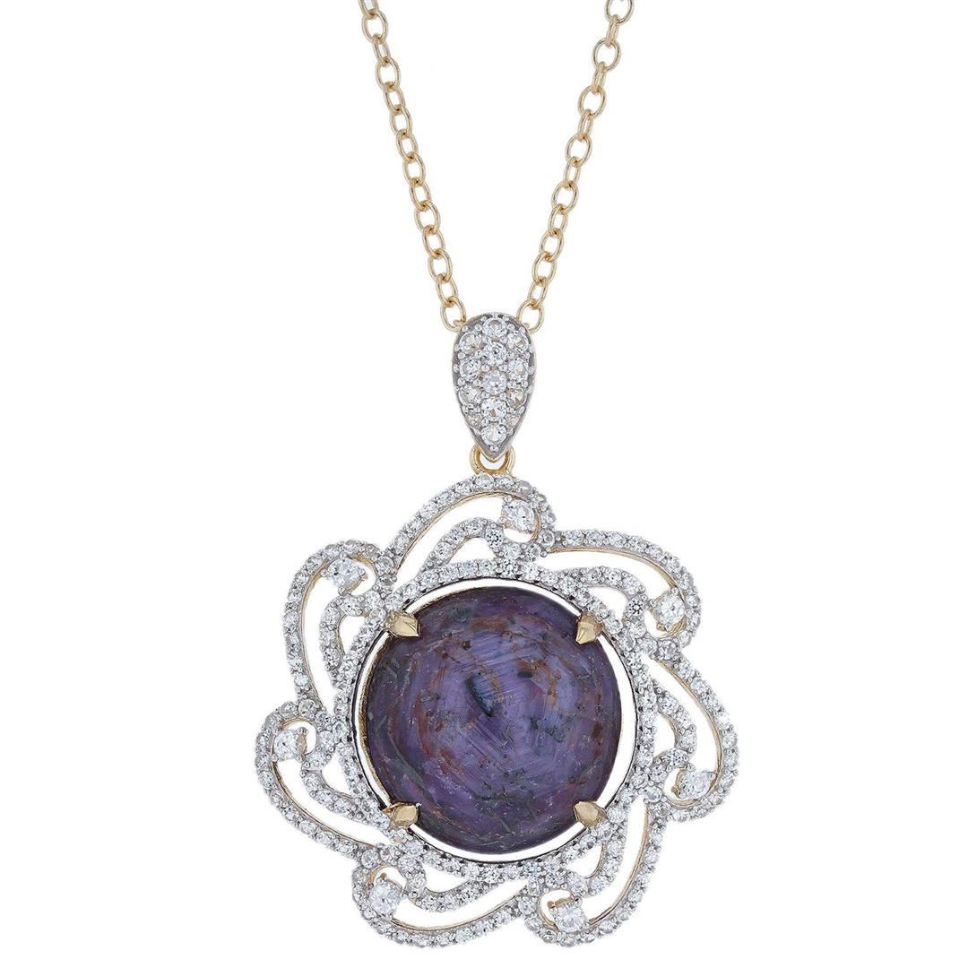 Electronically tested 925 silver ladies cast & assembled sapphire pendant and chain with gold overlay. 18" length. Trademark is Orianne. Identified with markings of "925". Condition is new, good workmanship. Containing: One prong set round cabochon cut natural purple sapphire with chatoyancy phenomena, measuring 21.00 x 21.00 x 13.65mm, approximate weight of 63.46ct., type II, dark, grayish, purple color, (GIA P 7/1), cut is good. One hundred eighty-five prong set round mixed cut natural white sapphires, measuring 2.50 - 1.50 x 1.31 mm, approximate total weight of 4.37ct., clarity is eye clean, colorless, very slightly grayish, white color, (GIA W 0/3), cut is good. Total Weight of Colored Stones 67.83 ct. Total Weight of Pendant With Chain 26.00 gm