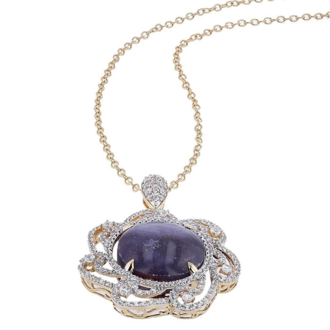Electronically tested 925 silver ladies cast & assembled sapphire pendant and chain with gold overlay. 18" length. Trademark is Orianne. Identified with markings of "925". Condition is new, good workmanship. Containing: One prong set round cabochon cut natural purple sapphire with chatoyancy phenomena, measuring 21.00 x 21.00 x 13.65mm, approximate weight of 63.46ct., type II, dark, grayish, purple color, (GIA P 7/1), cut is good. One hundred eighty-five prong set round mixed cut natural white sapphires, measuring 2.50 - 1.50 x 1.31 mm, approximate total weight of 4.37ct., clarity is eye clean, colorless, very slightly grayish, white color, (GIA W 0/3), cut is good. Total Weight of Colored Stones 67.83 ct. Total Weight of Pendant With Chain 26.00 gm