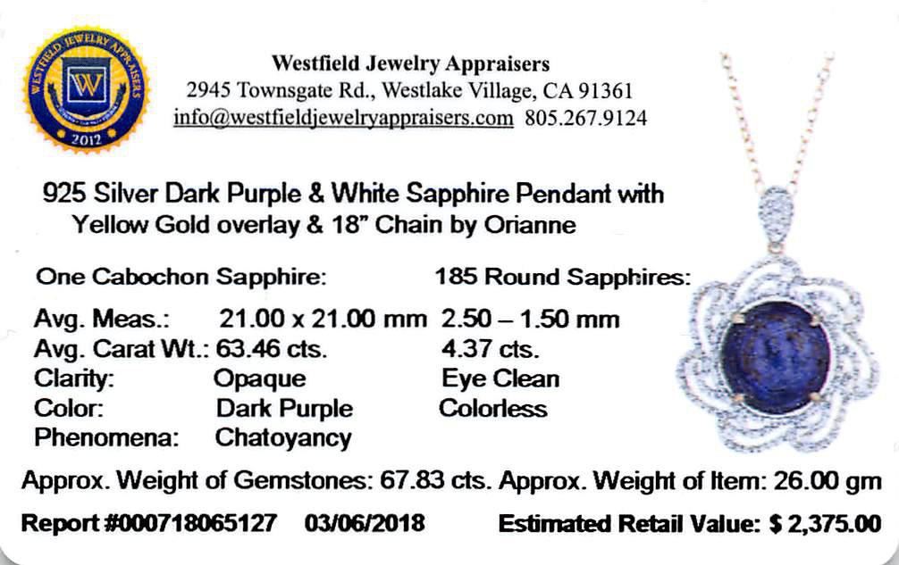 Electronically tested 925 silver ladies cast & assembled sapphire pendant and chain with gold overlay. 18" length. Trademark is Orianne. Identified with markings of "925". Condition is new, good workmanship. Containing: One prong set round cabochon cut n