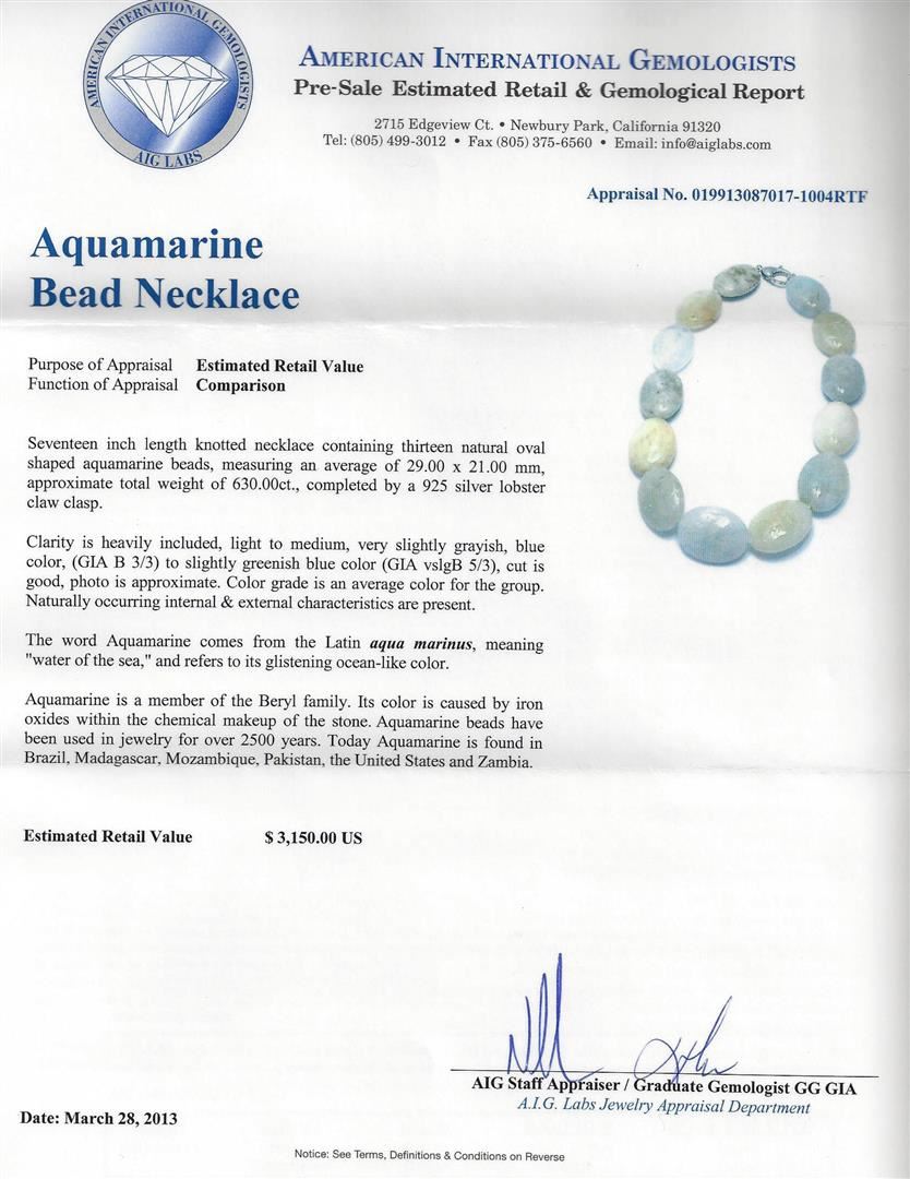 Seventeen inch length knotted necklace containing thirteen natural oval shaped aquamarine beads, measuring an average of 29.00 x 21.00 mm, approximate total weight of 630.00ct., completed by a 925 silver lobster claw clasp. Clarity is heavily included, light to medium, very slightly grayish, blue color, (GIA B 3/3) to slightly greenish blue color (GIA vslgB 5/3), cut is good, photo is approximate. Color grade is an average color for the group. Naturally occurring internal & external characteristics are present. The word Aquamarine comes from the Latin aqua marinus, meaning "water of the sea," and refers to its glistening ocean-like color. Aquamarine is a member of the Beryl family. Its color is caused by iron oxides within the chemical makeup of the stone. Aquamarine beads have been used in jewelry for over 2500 years. Today Aquamarine is found in Brazil, Madagascar, Mozambique, Pakistan, the United States and Zambia. AIG Appraised at $3,150.00.