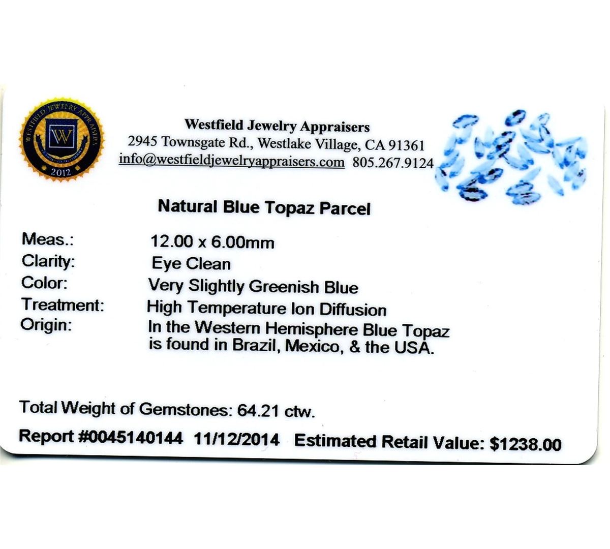 64.21cts Marquise Cut Natural Blue Topaz Parcel. Westfield Appraised at $1,238.00.