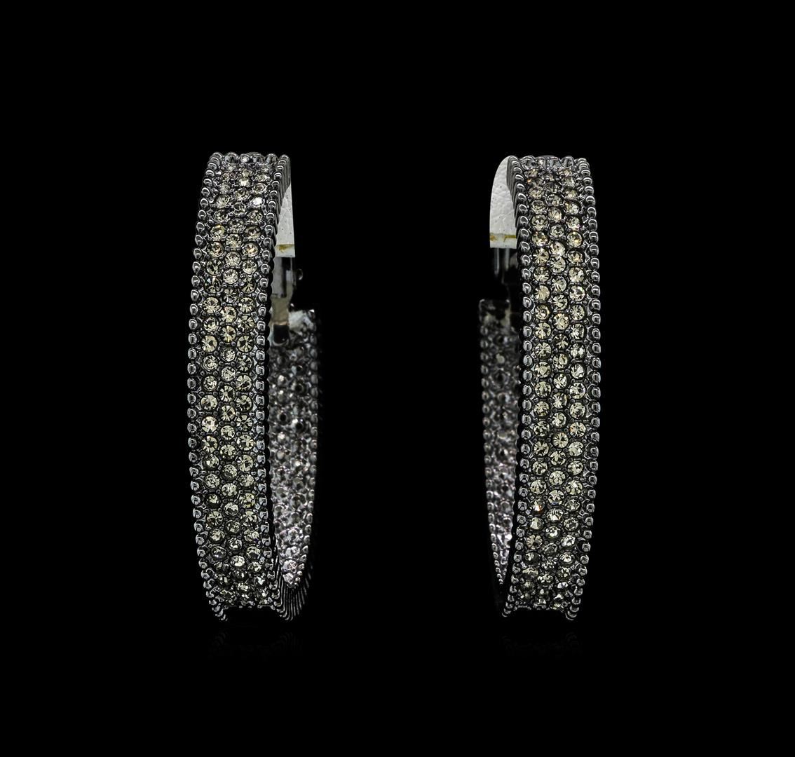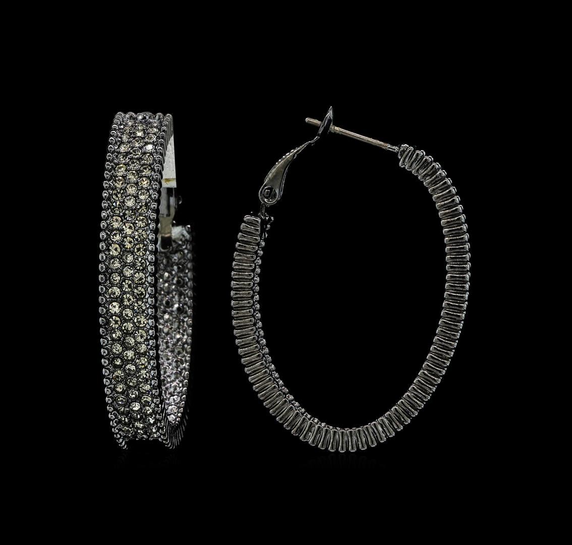 High end designer jewelry. 6x38mm Crystal Hoop Earrings - Black Rhodium. Black/ Rhodium Plated Metal. Black/ Smoky. Hoop.
