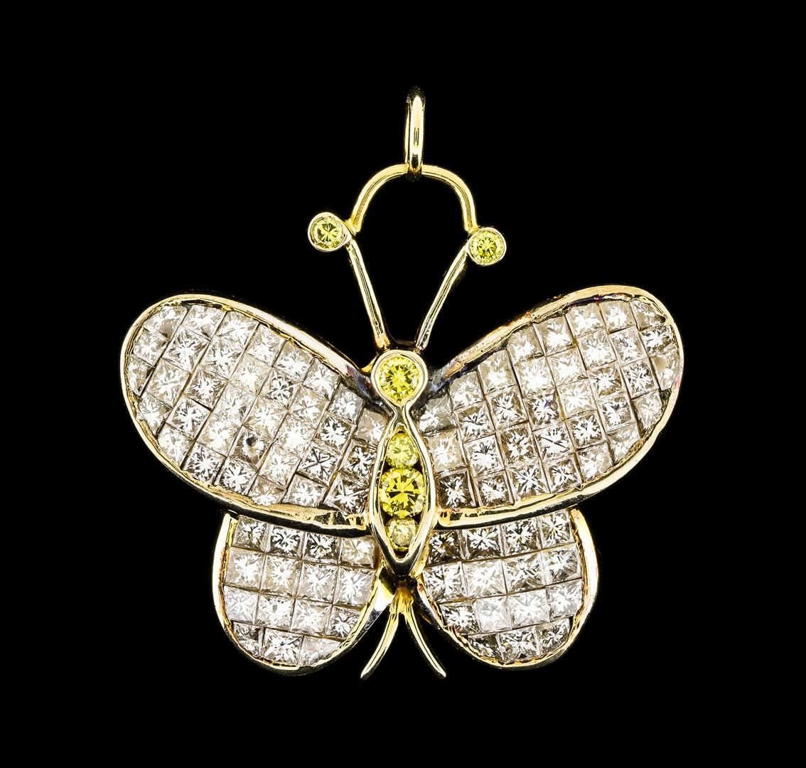 One electronically tested 18KT yellow gold ladies cast & assembled diamond butterfly pendant. The one and one-half inch wide butterfly pendant features a body, head and antennae of yellow diamonds set within white diamond wings. Bright polish finish. Condition is good. Containing: Six bezel set round brilliant cut diamonds approximate total weight of 6 Stones = 0.45ct. Indications of laboratory irradiated enhanced color. Graded in the setting. Clarity SI-1 to SI-2 Ninety-Seven invisible set princess and triangle cut diamonds approximate total weight of 97 Stones = 6.55ct. Graded in the setting. Clarity VS-1 to VS-2. Color: H - J. Total Weight of Diamonds 7.00ct.. Total Weight of Pendant 17.52gm. AIG Appraised at $23,050.00.