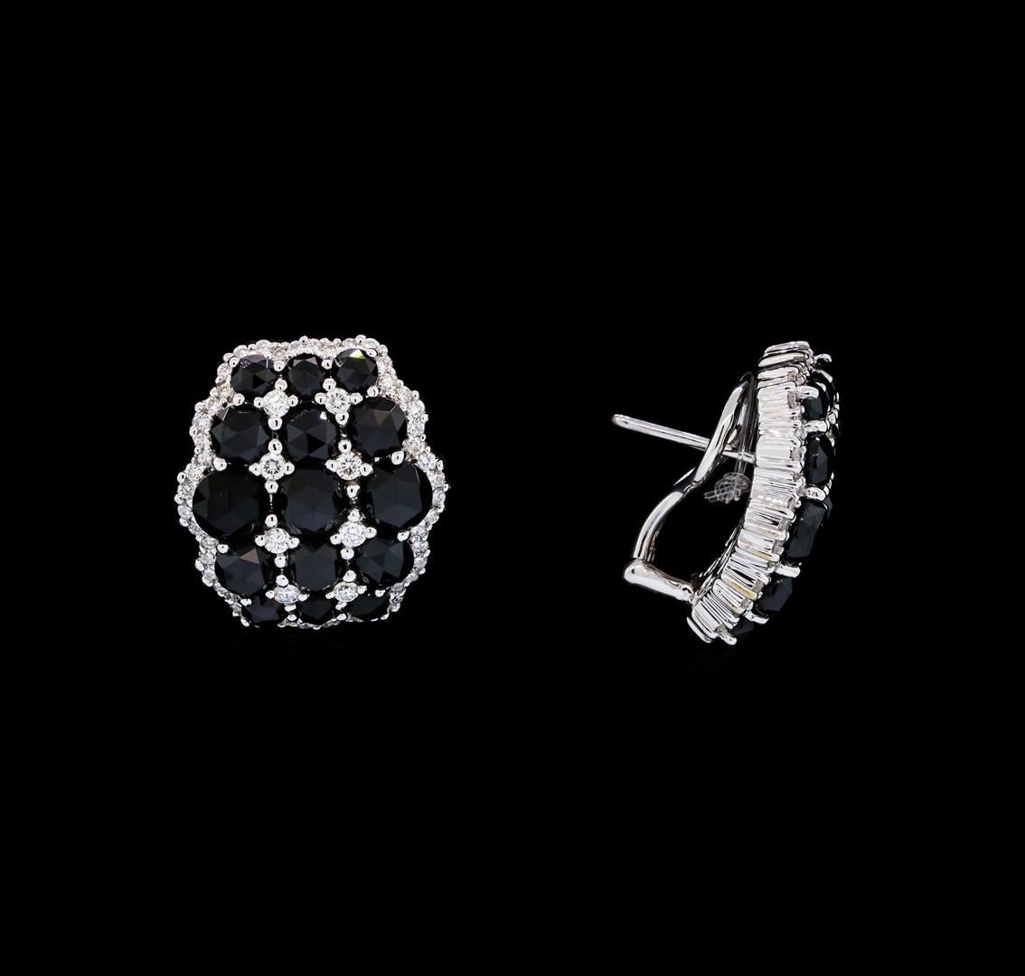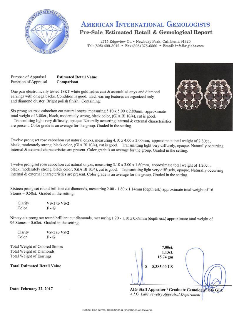 One pair electronically tested 18KT white gold ladies cast & assembled onyx and diamond earrings with omega backs. Each earring features an organized only and diamond cluster. Bright polish finish. Condition is good. Containing: Six prong set rose cabochon cut natural onyxs, measuring 5.10 x 5.00 x 2.80mm, approximate total weight of 3.00ct., black, moderately strong, black color, (GIA Bl 10/4), cut is good. Transmitting light very diffusely, opaque. Naturally occurring internal & external characteristics are present. Color grade is an average for the group. Graded in the setting. Twelve prong set rose cabochon cut natural onyxs, measuring 4.10 x 4.00 x 2.00mm, approximate total weight of 2.80ct., black, moderately strong, black color, (GIA Bl 10/4), cut is good. Transmitting light very diffusely, opaque. Naturally occurring internal & external characteristics are present. Color grade is an average for the group. Graded in the setting. Twelve prong set rose cabochon cut natural onyxs, measuring 3.10 x 3.00 x 1.60mm, approximate total weight of 1.20ct., black, moderately strong, black color, (GIA Bl 10/4), cut is good. Transmitting light very diffusely, opaque. Naturally occurring internal & external characteristics are present. Color grade is an average for the group. Graded in the setting. Sixteen prong set round brilliant cut diamonds, measuring 2.00 - 1.80 x 1.14mm (depth est.) approximate total weight of 16 Stones = 0.50ct. Graded in the setting. Clarity VS-1 to VS-2. Color: F - G Ninety-Six prong set round brilliant cut diamonds, measuring 1.20 - 1.10 x 0.69mm (depth est.) approximate total weight of 96 Stones = 0.63ct. Graded in the setting. Clarity VS-1 to VS-2. Color: F - G. Total Weight of Colored Stones 7.00ct.. Total Weight of Diamonds 1.13ct.. Total Weight of Earrings 15.74gm. AIG Appraised at $8,385.00.