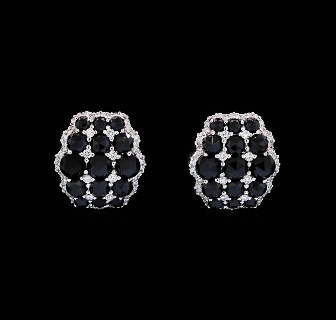 One pair electronically tested 18KT white gold ladies cast & assembled onyx and diamond earrings with omega backs. Each earring features an organized only and diamond cluster. Bright polish finish. Condition is good. Containing: Six prong set rose cabochon cut natural onyxs, measuring 5.10 x 5.00 x 2.80mm, approximate total weight of 3.00ct., black, moderately strong, black color, (GIA Bl 10/4), cut is good. Transmitting light very diffusely, opaque. Naturally occurring internal & external characteristics are present. Color grade is an average for the group. Graded in the setting. Twelve prong set rose cabochon cut natural onyxs, measuring 4.10 x 4.00 x 2.00mm, approximate total weight of 2.80ct., black, moderately strong, black color, (GIA Bl 10/4), cut is good. Transmitting light very diffusely, opaque. Naturally occurring internal & external characteristics are present. Color grade is an average for the group. Graded in the setting. Twelve prong set rose cabochon cut natural onyxs, measuring 3.10 x 3.00 x 1.60mm, approximate total weight of 1.20ct., black, moderately strong, black color, (GIA Bl 10/4), cut is good. Transmitting light very diffusely, opaque. Naturally occurring internal & external characteristics are present. Color grade is an average for the group. Graded in the setting. Sixteen prong set round brilliant cut diamonds, measuring 2.00 - 1.80 x 1.14mm (depth est.) approximate total weight of 16 Stones = 0.50ct. Graded in the setting. Clarity VS-1 to VS-2. Color: F - G Ninety-Six prong set round brilliant cut diamonds, measuring 1.20 - 1.10 x 0.69mm (depth est.) approximate total weight of 96 Stones = 0.63ct. Graded in the setting. Clarity VS-1 to VS-2. Color: F - G. Total Weight of Colored Stones 7.00ct.. Total Weight of Diamonds 1.13ct.. Total Weight of Earrings 15.74gm. AIG Appraised at $8,385.00.