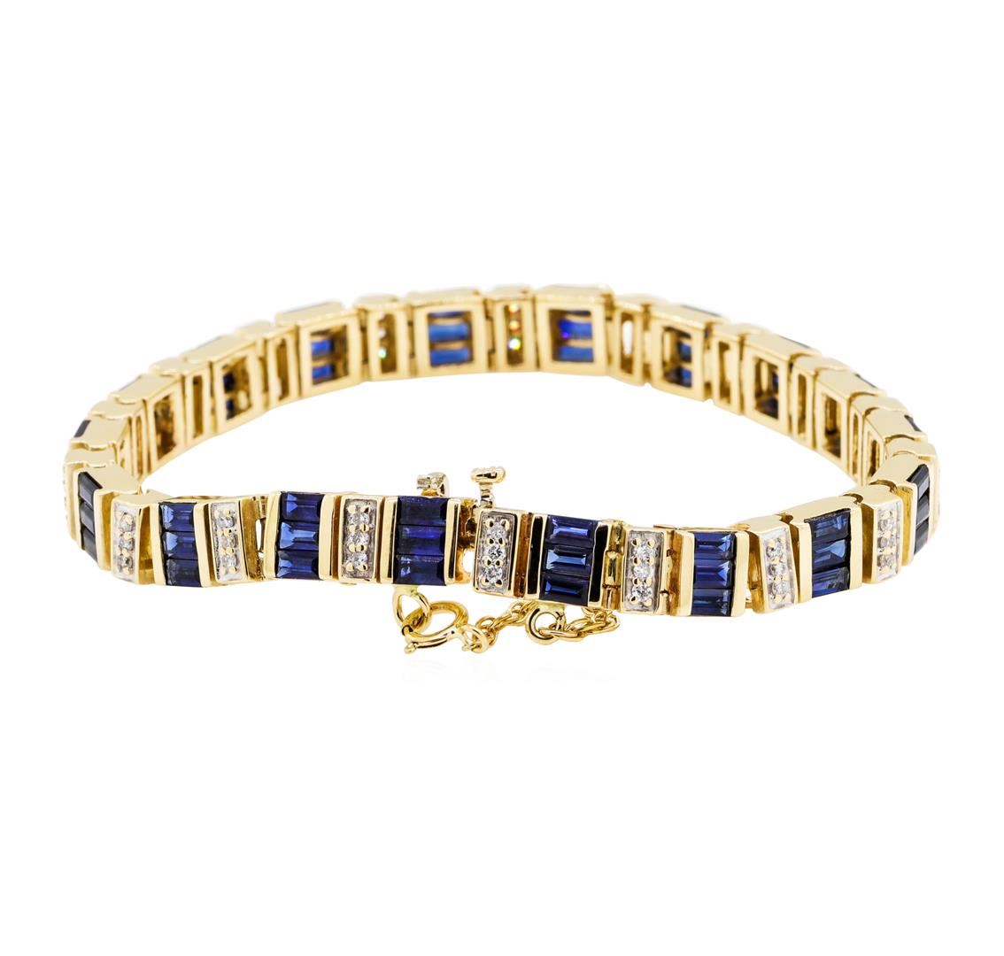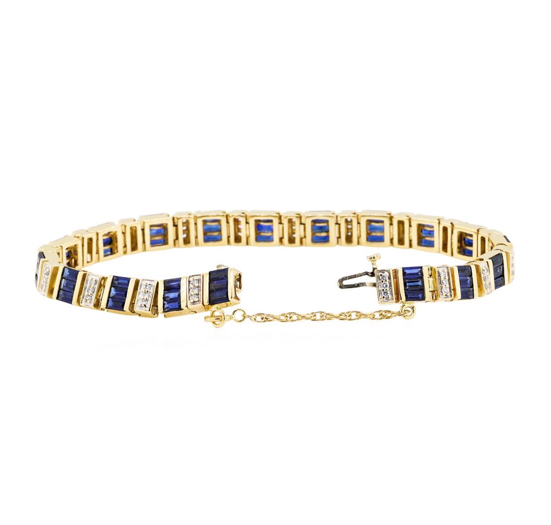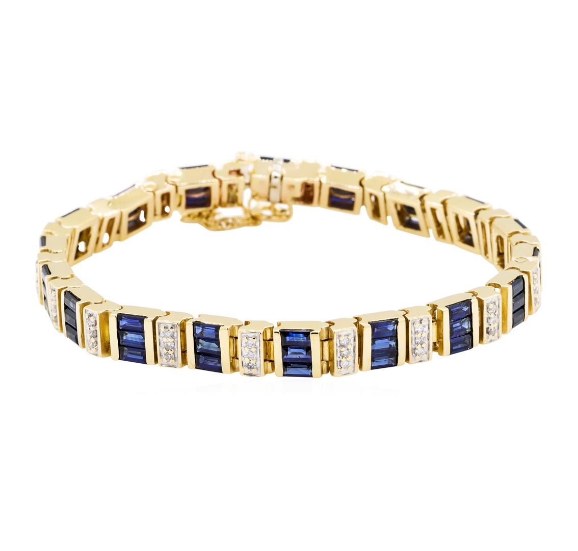 One electronically tested 14KT yellow gold lady's combination cast & assembled fashion bracelet with a tongue clasp with foldover safety with a bright polish finish. The featured lady's bracelet measures approximately seven and a quarter inches in length and has an attached safety chain. Identified with markings of '14K'. Condition is new, good workmanship. Containing: Fifty-four channel set baguette modified step cut natural blue sapphires, measuring 4.00 x 2.10 x 1.37mm, (depth est.) approximate total weight of 7.00ct., clarity is eye clean, medium dark, moderately strong, blue color, (GIA B 6/4), cut is very good. Transmitting light with no distortion, transparent. Colored gemstones are presumed to have been subjected to commonly used enhancement processes. Graded in the setting. Fifty-Four prong set round brilliant cut diamonds, measuring 1.65 - 1.55 x 0.99mm (depth est.) approximate total weight of 54 Stones = 0.85ct. Graded in the setting. Color H - I Clarity SI-2 to I-1 Cut Good. Total Weight of Colored Stones 7.00ct.. Total Weight of Diamonds 0.85ct.. Total Weight of Bracelet 28.00gm GAS Appraised at $9075.00. GAS Appraised at $9,075.00.