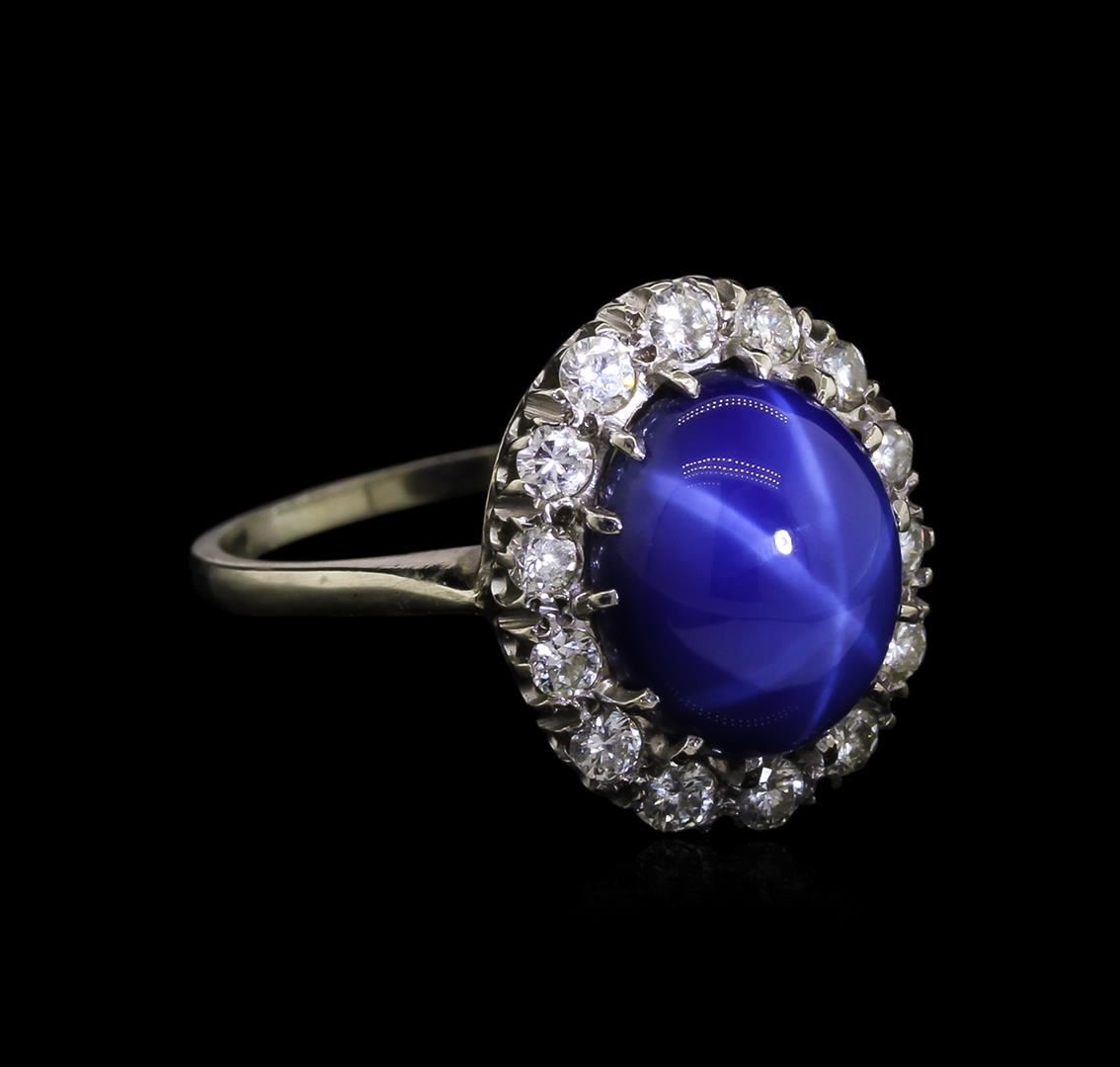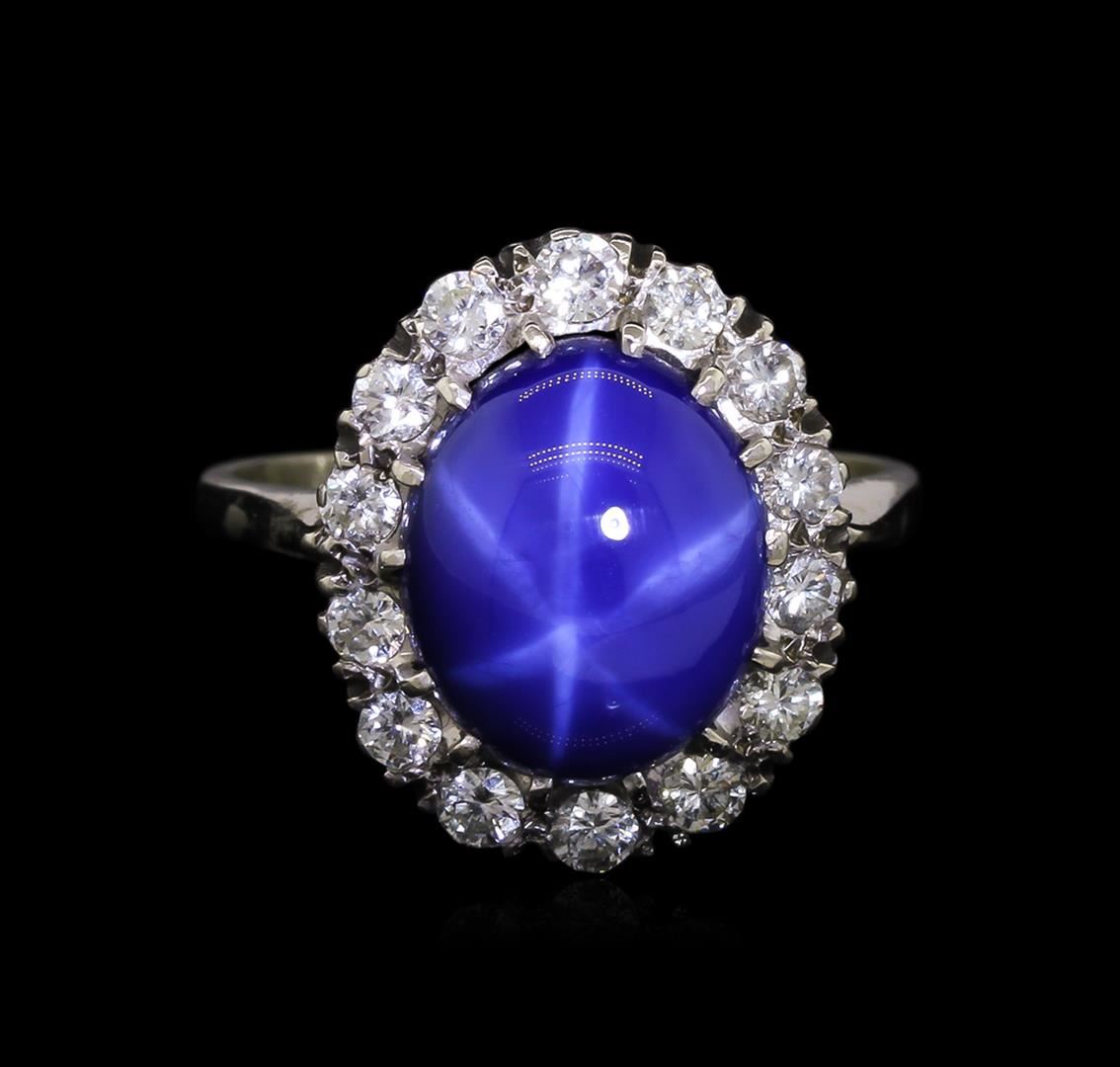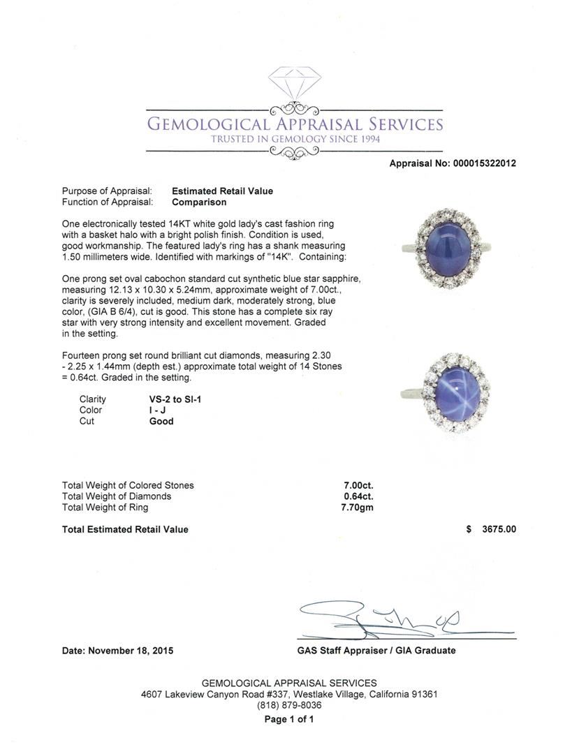One electronically tested 14KT white gold lady's cast fashion ring with a basket halo with a bright polish finish. The featured lady's ring has a shank measuring 1.50 millimeters wide. Identified with markings of "14K". Condition is used, good workmanship. Containing: One prong set oval cabochon standard cut synthetic blue star sapphire, measuring 12.13 x 10.30 x 5.24mm, approximate weight of 7.00ct., clarity is severely included, medium dark, moderately strong, blue color, (GIA B 6/4), cut is good. This stone has a complete six ray star with very strong intensity and excellent movement. Graded in the setting. Fourteen prong set round brilliant cut diamonds, measuring 2.30 - 2.25 x 1.44mm (depth est.) approximate. Total Weight of 14 Stones = 0.64ct. Graded in the setting. Clarity: VS-2 to SI-1. Color: I - Good. Total Weight of Colored Stones 7.00ct. Total Weight of Diamonds 0.64ct. Total Weight of Ring 7.70gm. GAS Appraised.