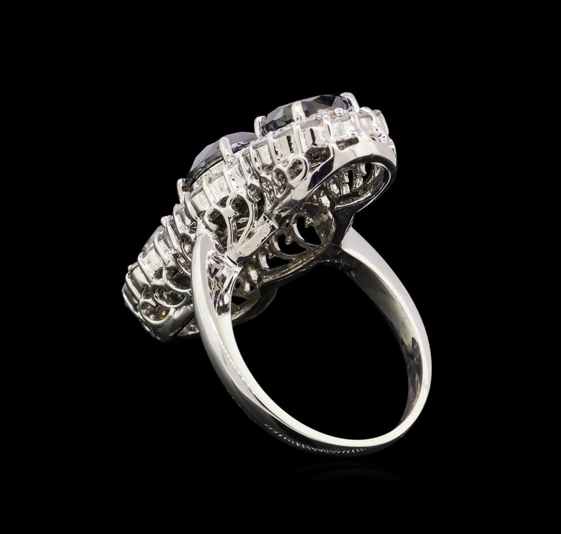 One electronically tested 14KT white gold ladies cast & assembled black and white diamond ring with a bright polish finish. Identified with markings of "K14". Condition is new, good workmanship. Containing: Three prong set round brilliant cut diamonds, measuring 8.50 - 6.90 x 4.62mm (depth est.) approximate total weight of 3 Stones = 5.52ct. Indications of multiple laboratory enhancements. Graded in the setting. Clarity Déclassé‚. Color: Fancy Black; Irradiated. Thirty-Six prong set round brilliant cut diamonds, measuring 2.70 - 2.00 x 1.41mm (depth est.) approximate total weight of 36 Stones = 1.50ct. Graded in the setting. Clarity: I-1 to I-2. Color: G - I. Total Weight of Diamonds 7.02ct. Total Weight of Ring 11.20gm. AIG Appraised at $7,060.00.