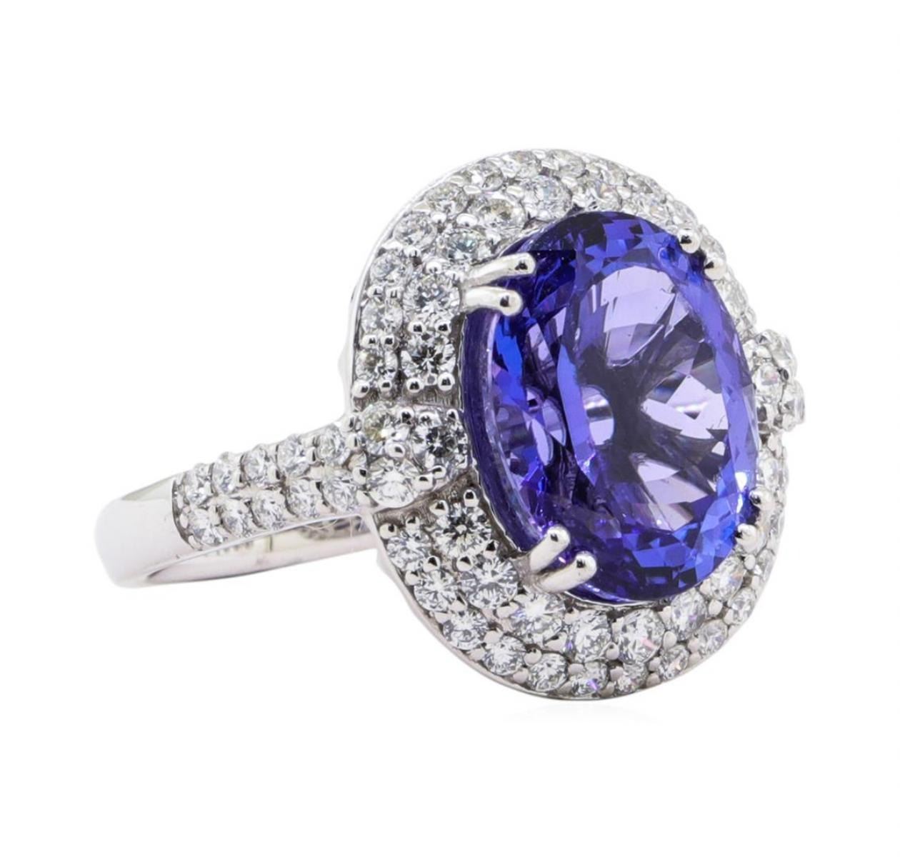 One electronically tested platinum ladies cast tanzanite & diamond ring. The featured tanzanite is set within a diamond bezel, supported by a lattice under gallery and diamond set shoulders, completed by a three millimeter wide band. Bright polish finish. Trademark is Orianne. Identified with markings of "PT950". Condition is new, good workmanship. Containing: One prong set oval modified brilliant cut natural tanzanite, measuring 13.13 x 10.14 x 7.20mm, exact weight 7.05ct., type I Clarity is eye clean, medium, very slightly grayish, violet-blue color, (GIA VB 5/3), cut is good. Transmitting light with no distortion, transparent. GIA Gemological Report attached. Graded loose prior to setting in the GIA Laboratory, Report #1172871664.Tanzanite is a very rare gemstone that is only found in the country of Tanzania. Originally discovered in 1967. Tiffany & Company, named the stone Tanzanite. It is found in the Usumburu Mountains that border the Umba Valley of northern Tanzania. Tanzanite occurs in gray, brown, violet, blue, reddish-purple, & green. The gem is interesting because of its exceptional pleochroism. Rotated in different directions a tanzanite will exhibit multiple changes of color. Tanzanite has a low tolerance to ultrasonic cleaning, and should not be cleaned using this method. Seventy prong set round brilliant cut diamonds, measuring 1.90 - 1.40 x 0.99mm (depth est.) exact total weight 70 Stones = 1.20 ct. Graded in the setting. Clarity SI-1 to SI-2 Color F - H Total Weight of Colored Stones 7.05 ct. Total Weight of Diamonds 1.20 ct. Total Weight of Ring 10.50 gm Estimated Retail Value $ 21,990.00 US