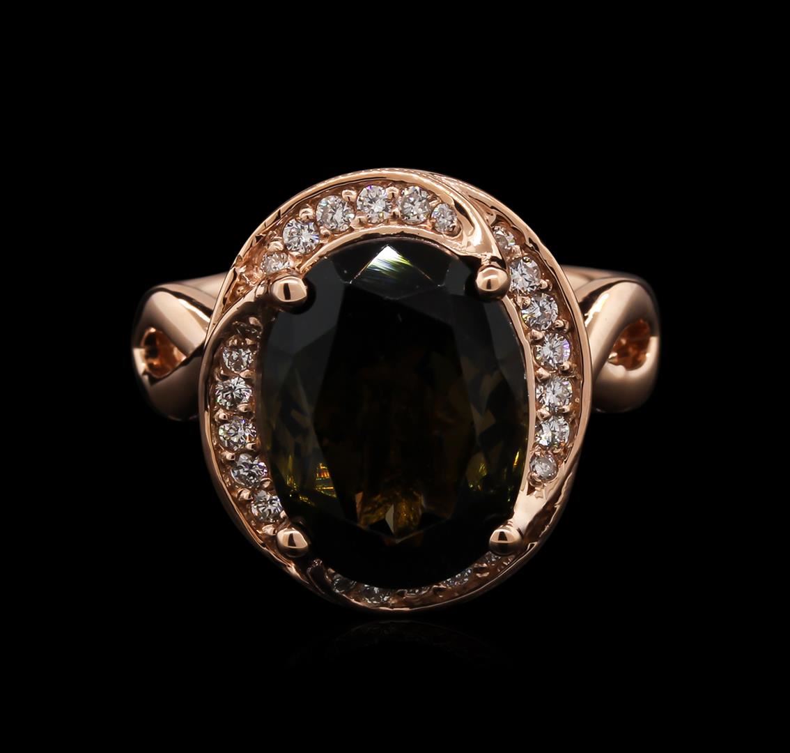 One ring featuring: 14KT rose gold weighing 7.44 grams containing one green tourmaline with a total weight of 7.05ct and diamonds with a total weight of 0.31ct.