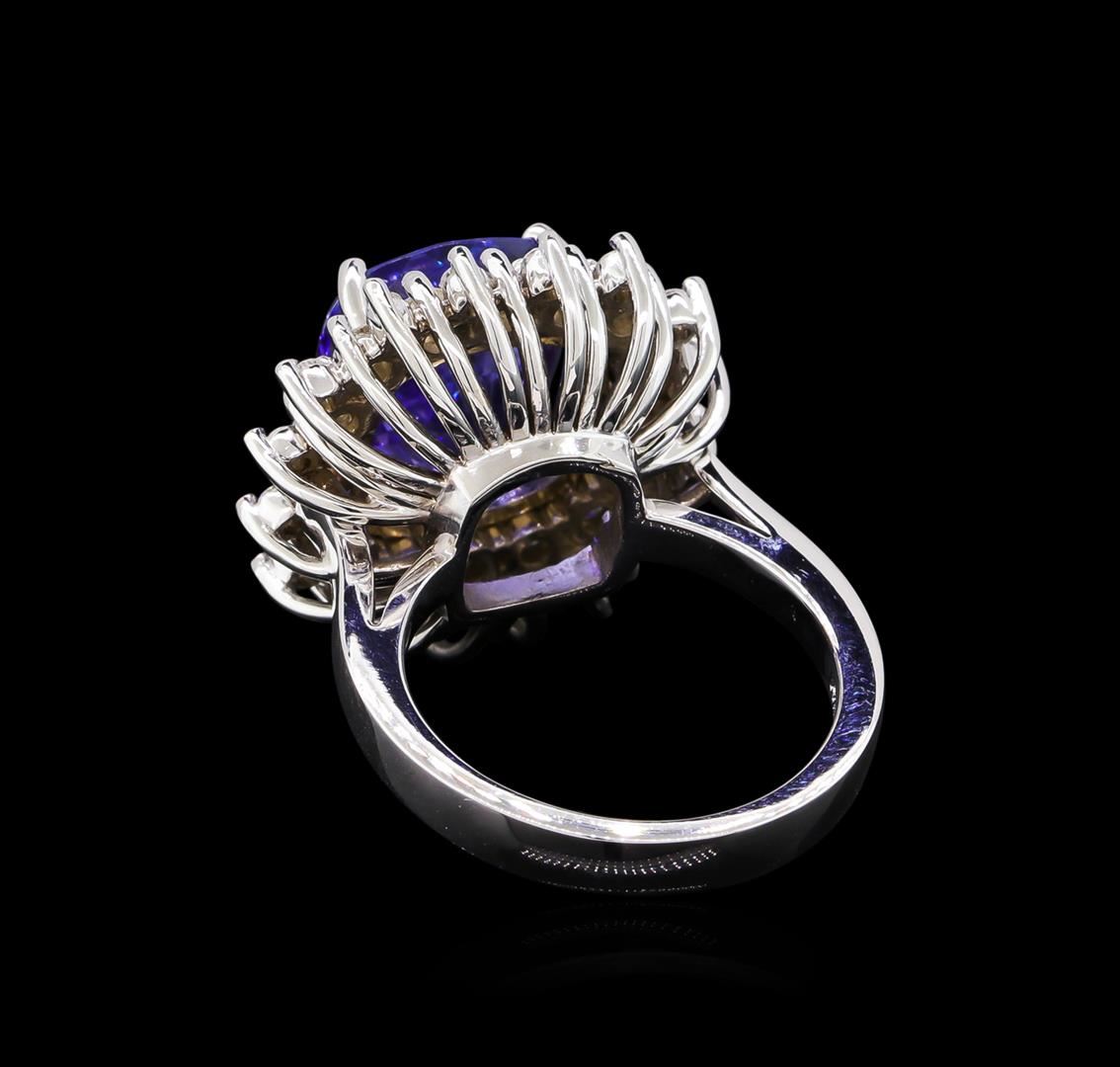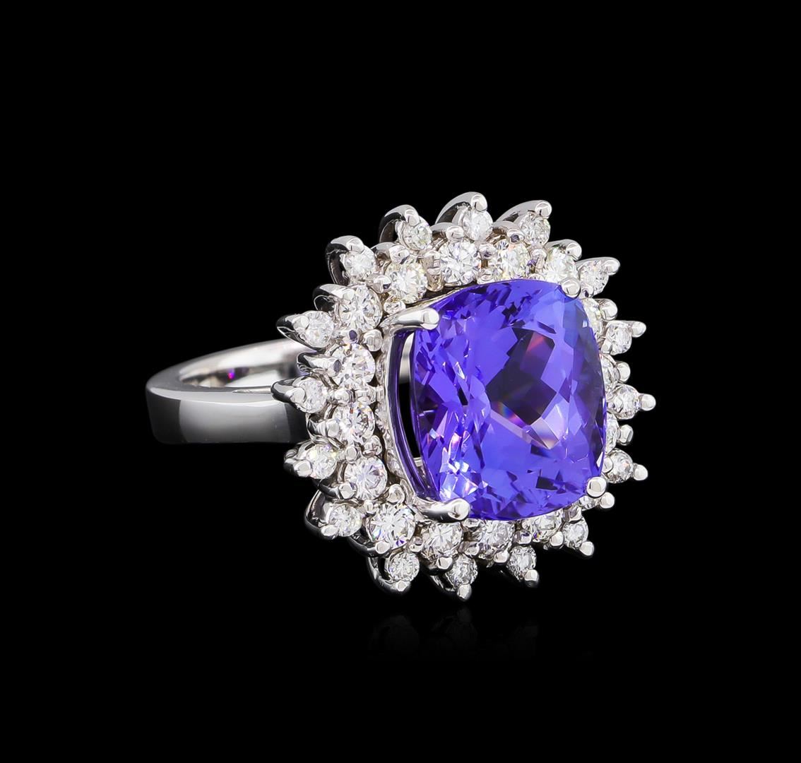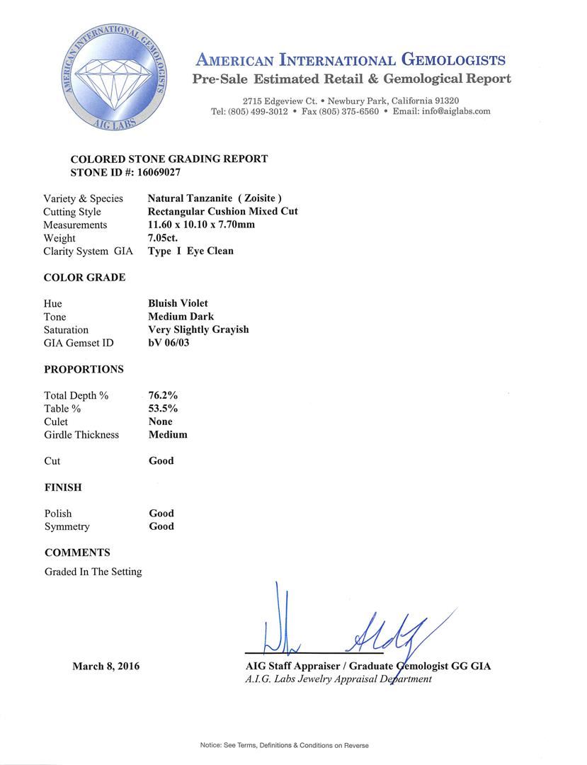One electronically tested 14KT white gold ladies cast tanzanite and diamond ring with a bright polish finish. The featured tanzanite is set within a diamond floret supported by a ribbed under gallery, completed by a three millimeter wide band. Identified with markings of "14K". Condition is new, good workmanship. Containing: One prong set rectangular cushion mixed cut natural tanzanite, measuring 11.60 x 10.10 x 7.70mm, approximate weight of 7.05ct., clarity is eye clean, type I, medium dark, very slightly grayish, bluish violet color, (GIA bV 6/3), cut is good. Transmitting light with no distortion, transparent. Colored Stone Grading Report attached. Graded in the setting. Tanzanite is a very rare gemstone that is only found in the country of Tanzania. Originally discovered in 1967. Tiffany & Company, named the stone Tanzanite. It is found in the Usumburu Mountains that border the Umba Valley of northern Tanzania. Tanzanite occurs in gray, brown, violet, blue, reddish-purple, & green. The gem is interesting because of its exceptional pleochroism. Rotated in different directions a tanzanite will exhibit multiple changes of color. Tanzanite has a low tolerance to ultrasonic cleaning, and should not be cleaned using this method. Thirty-Two prong set round brilliant cut diamonds approximate total weight of 32 Stones = 0.98ct. The clarity grade reflects the entire range of clarity for this group. Graded in the setting. Clarity: VS-2 to I-1. Color: D - F. Total Weight of Colored Stones 7.05ct. Total Weight of Diamonds 0.98ct. Total Weight of Ring 11.15gm. AIG Appraised at $20,510.00.