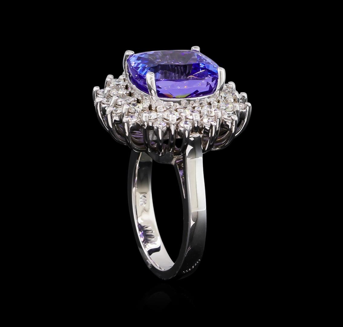 One electronically tested 14KT white gold ladies cast tanzanite and diamond ring with a bright polish finish. The featured tanzanite is set within a diamond floret supported by a ribbed under gallery, completed by a three millimeter wide band. Identified with markings of "14K". Condition is new, good workmanship. Containing: One prong set rectangular cushion mixed cut natural tanzanite, measuring 11.60 x 10.10 x 7.70mm, approximate weight of 7.05ct., clarity is eye clean, type I, medium dark, very slightly grayish, bluish violet color, (GIA bV 6/3), cut is good. Transmitting light with no distortion, transparent. Colored Stone Grading Report attached. Graded in the setting. Tanzanite is a very rare gemstone that is only found in the country of Tanzania. Originally discovered in 1967. Tiffany & Company, named the stone Tanzanite. It is found in the Usumburu Mountains that border the Umba Valley of northern Tanzania. Tanzanite occurs in gray, brown, violet, blue, reddish-purple, & green. The gem is interesting because of its exceptional pleochroism. Rotated in different directions a tanzanite will exhibit multiple changes of color. Tanzanite has a low tolerance to ultrasonic cleaning, and should not be cleaned using this method. Thirty-Two prong set round brilliant cut diamonds approximate total weight of 32 Stones = 0.98ct. The clarity grade reflects the entire range of clarity for this group. Graded in the setting. Clarity: VS-2 to I-1. Color: D - F. Total Weight of Colored Stones 7.05ct. Total Weight of Diamonds 0.98ct. Total Weight of Ring 11.15gm. AIG Appraised at $20,510.00.