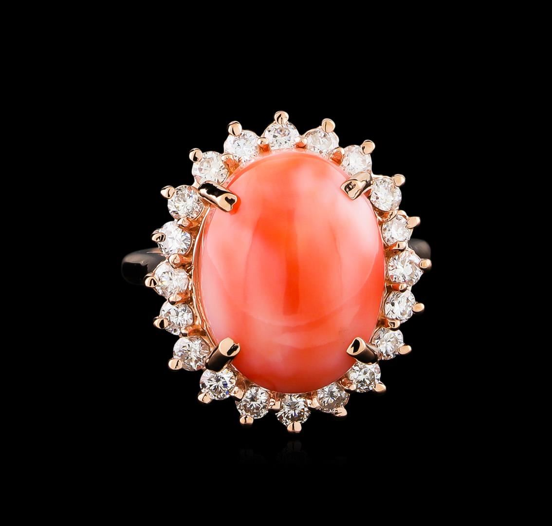 One electronically tested 14KT rose gold ladies cast coral and diamond ring with a bright polish finish. The featured coral cabochon is set within a diamond floret supported by a ribbed under gallery, completed by a two millimeter wide band. Identified with markings of "14K". Condition is new, good workmanship. Containing: One prong set oval cabochon cut natural salmon coral, measuring 16.00 x 12.10 x 5.10mm, approximate weight of 7.06ct., medium, very slightly brownish, orangy red color, (GIA oR 5/3), cut is good. Transmitting light very diffusely, opaque. Naturally occurring internal & external characteristics are present. Graded in the setting. Salmon Coral is formed undersea by microscopic animals called coral polyps. These tiny creatures form minute, hard shells. As a colony grows, it takes on complex branching, tree-like forms which allows the maximum number of polyps to be fed by the nutrients in the water. It grows about one quarter inch per year. This color of coral is commonly treated to improve or change the color and stability. Evidence that may confirm this is typically lacking. Twenty prong set round brilliant cut diamonds, measuring 2.40 - 2.35 x 1.43mm (depth est.) approximate total weight of 20 Stones = 0.98ct. Graded in the setting. Clarity: SI-2 to I-2. Color: G - I. Total Weight of Colored Stones 7.06ct. Total Weight of Diamonds 0.98ct. Total Weight of Ring 7.66gm. AIG Appraised at $5,425.00.