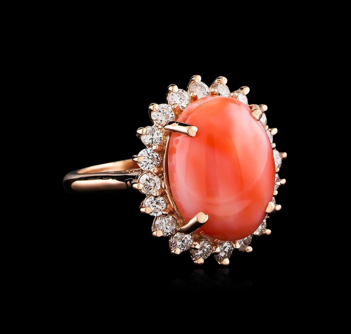 One electronically tested 14KT rose gold ladies cast coral and diamond ring with a bright polish finish. The featured coral cabochon is set within a diamond floret supported by a ribbed under gallery, completed by a two millimeter wide band. Identified with markings of "14K". Condition is new, good workmanship. Containing: One prong set oval cabochon cut natural salmon coral, measuring 16.00 x 12.10 x 5.10mm, approximate weight of 7.06ct., medium, very slightly brownish, orangy red color, (GIA oR 5/3), cut is good. Transmitting light very diffusely, opaque. Naturally occurring internal & external characteristics are present. Graded in the setting. Salmon Coral is formed undersea by microscopic animals called coral polyps. These tiny creatures form minute, hard shells. As a colony grows, it takes on complex branching, tree-like forms which allows the maximum number of polyps to be fed by the nutrients in the water. It grows about one quarter inch per year. This color of coral is commonly treated to improve or change the color and stability. Evidence that may confirm this is typically lacking. Twenty prong set round brilliant cut diamonds, measuring 2.40 - 2.35 x 1.43mm (depth est.) approximate total weight of 20 Stones = 0.98ct. Graded in the setting. Clarity: SI-2 to I-2. Color: G - I. Total Weight of Colored Stones 7.06ct. Total Weight of Diamonds 0.98ct. Total Weight of Ring 7.66gm. AIG Appraised at $5,425.00.