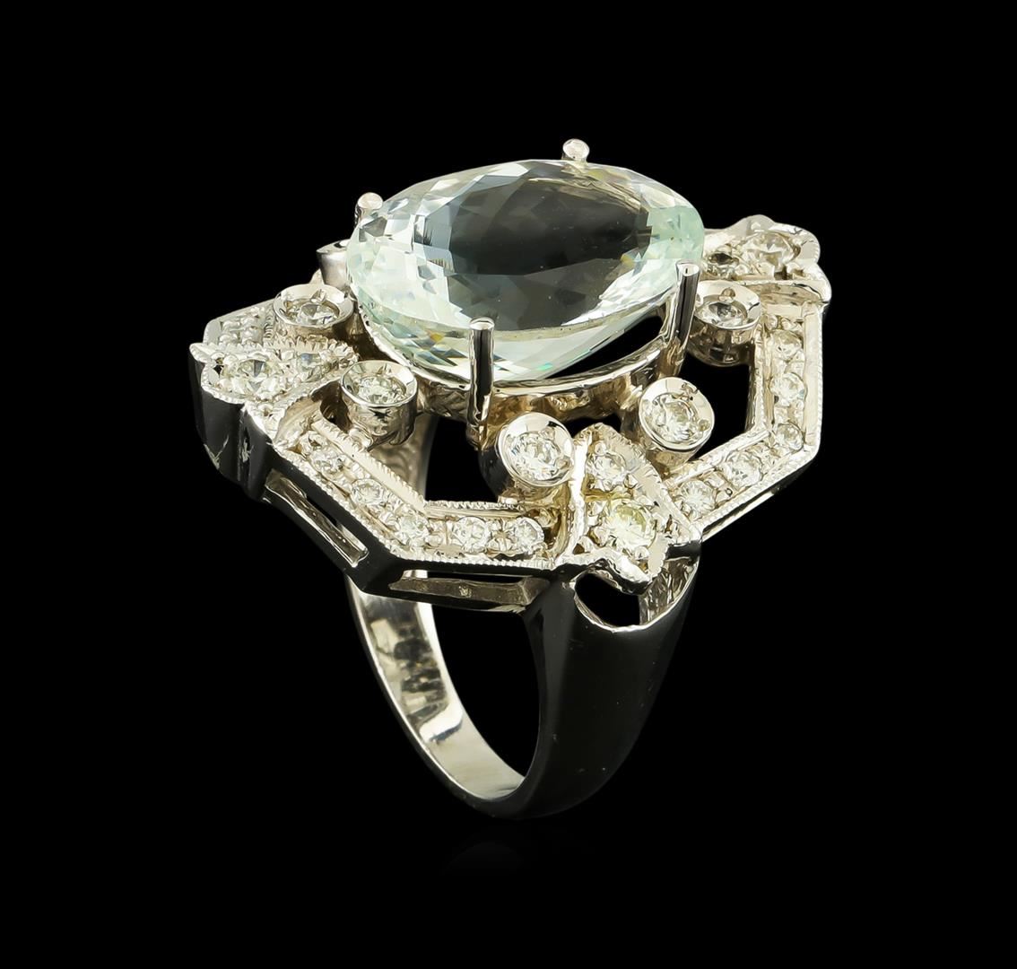 One electronically tested 14KT white gold lady's cast fashion ring with a tapered shank with a bright polish with milgrain detailing finish. The featured lady's ring has a shank measuring 2.68 millimeters wide. Condition is new, good workmanship. Containing: One pave' set oval modified brilliant cut natural aquamarine, measuring 15.10 x 11.15 x 7.59mm, approximate weight of 7.07ct., clarity is eye clean, type I, light, very slightly grayish, very slightly greenish blue color, (GIA vslgB 3/3), cut is good. Transmitting light with no distortion, transparent. Colored gemstones are presumed to have been subjected to commonly used enhancement processes. Graded in the setting. Twelve prong set round brilliant cut diamonds, measuring 2.30 - 2.00 x 1.33mm (depth est.) approximate total weight of 12 Stones = 0.45ct. Graded in the setting. Clarity: VS-2 to SI-1. Color: H - I. Cut Good Twenty-Four prong set round brilliant cut diamonds, measuring 1.70 - 1.60 x 0.99mm (depth est.) approximate total weight of 24 Stones = 0.38ct. Graded in the setting. Clarity: SI-1 to SI-2. Color: H - I. Cut Good. Total Weight of Colored Stones 7.07ct. Total Weight of Diamonds 0.83ct. Total Weight of Ring 9.50gm. GAS Appraised at $8,440.00.