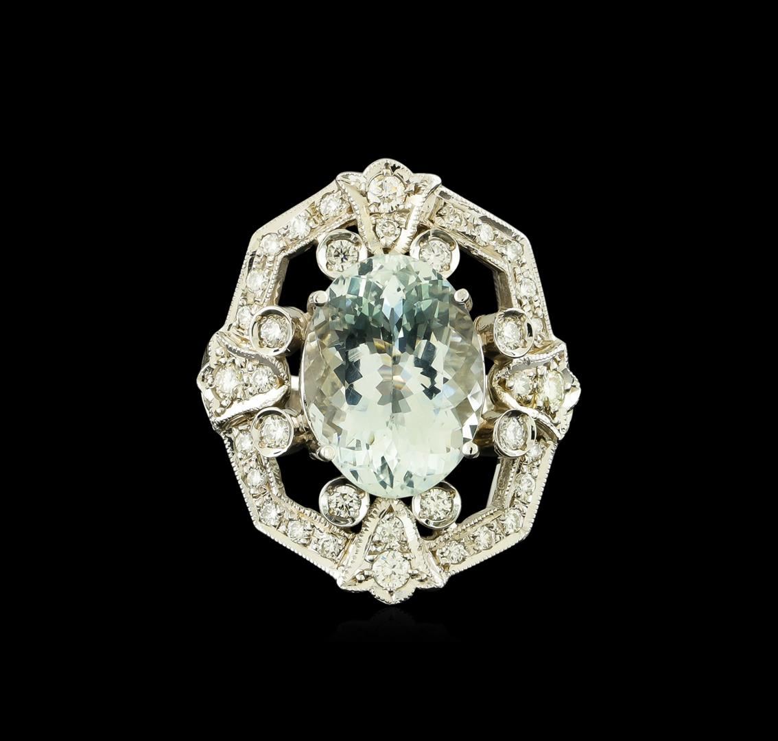 One electronically tested 14KT white gold lady's cast fashion ring with a tapered shank with a bright polish with milgrain detailing finish. The featured lady's ring has a shank measuring 2.68 millimeters wide. Condition is new, good workmanship. Containing: One pave' set oval modified brilliant cut natural aquamarine, measuring 15.10 x 11.15 x 7.59mm, approximate weight of 7.07ct., clarity is eye clean, type I, light, very slightly grayish, very slightly greenish blue color, (GIA vslgB 3/3), cut is good. Transmitting light with no distortion, transparent. Colored gemstones are presumed to have been subjected to commonly used enhancement processes. Graded in the setting. Twelve prong set round brilliant cut diamonds, measuring 2.30 - 2.00 x 1.33mm (depth est.) approximate total weight of 12 Stones = 0.45ct. Graded in the setting. Clarity: VS-2 to SI-1. Color: H - I. Cut Good Twenty-Four prong set round brilliant cut diamonds, measuring 1.70 - 1.60 x 0.99mm (depth est.) approximate total weight of 24 Stones = 0.38ct. Graded in the setting. Clarity: SI-1 to SI-2. Color: H - I. Cut Good. Total Weight of Colored Stones 7.07ct. Total Weight of Diamonds 0.83ct. Total Weight of Ring 9.50gm. GAS Appraised at $8,440.00.