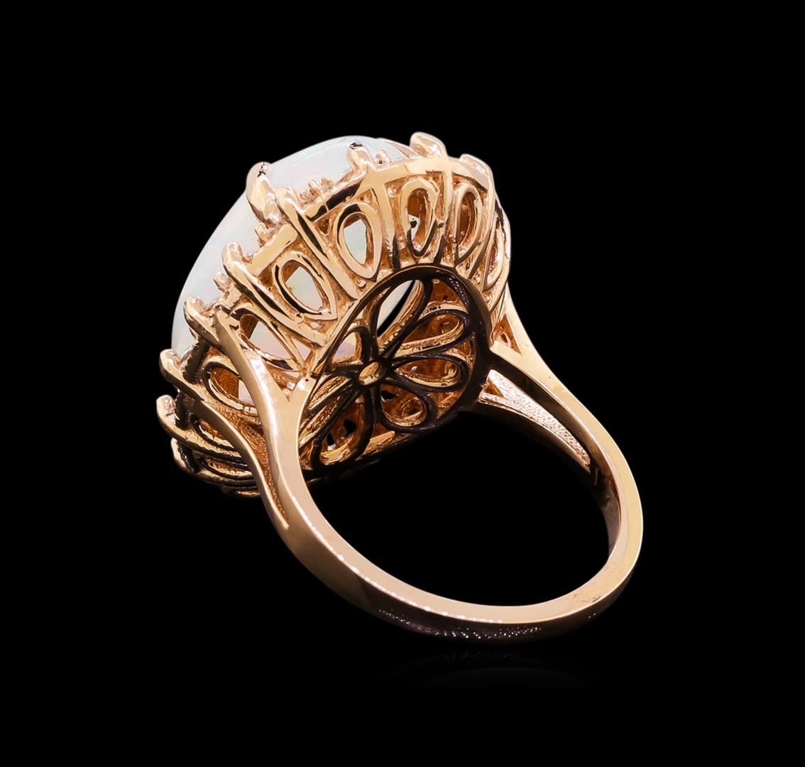 One electronically tested 14KT rose gold lady's cast fashion ring with a basket double halo with a bright polish finish. The featured lady's ring has a shank measuring 1.83 millimeters in width. Identified with markings of "K14". Condition is new, good workmanship. Containing: One crystal opal that is cut in a oval shaped cabochon and is prong set, measuring 18.45 mm long x 13.26 mm wide, and 6.23 mm thick and the exact weight is 7.08 carats. The opal has a bright, multicolor play of color (fire) in a rolling flashfire pattern; a medium dome; a good cut; ; consistent in its brightness and pattern; and is not directional. Transmitting light with a minimum of distortion, transparent. Graded in the setting. Sixteen prong set round brilliant cut diamonds, measuring 2.30 - 2.25 x 1.42mm (depth est.) approximate total weight of 16 Stones = 0.69ct. Graded in the setting. Clarity: SI-1 to SI-2. Color: H - I. Cut Good Sixteen prong set round brilliant cut diamonds, measuring 1.30 - 1.20 x 0.78mm (depth est.) approximate total weight of 16 Stones = 0.13ct. Graded in the setting. Clarity: SI-1 to SI-2. Color: H - I. Cut Good Forty-Eight prong set round brilliant cut diamonds, measuring 1.00 - 0.90 x 0.58mm (depth est.) approximate total weight of 48 Stones = 0.14ct. Graded in the setting. Clarity: SI-1 to SI-2. Color: H - I. Cut Good. Total Weight of Diamonds 0.96ct. Total Weight of Opals 7.08ct. Total Weight of Ring 9.40gm. GAS Appraised at $6,120.00.