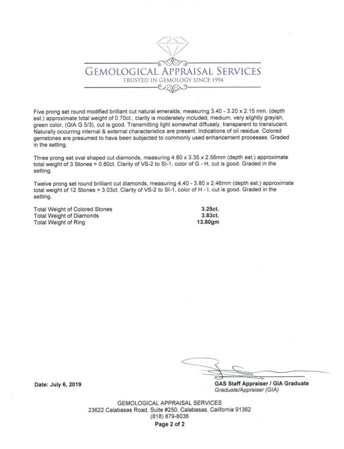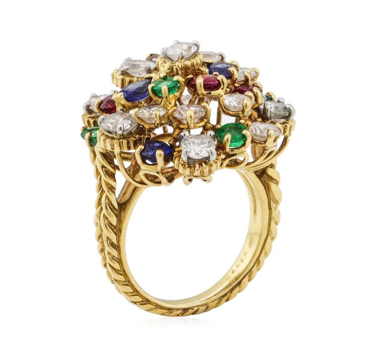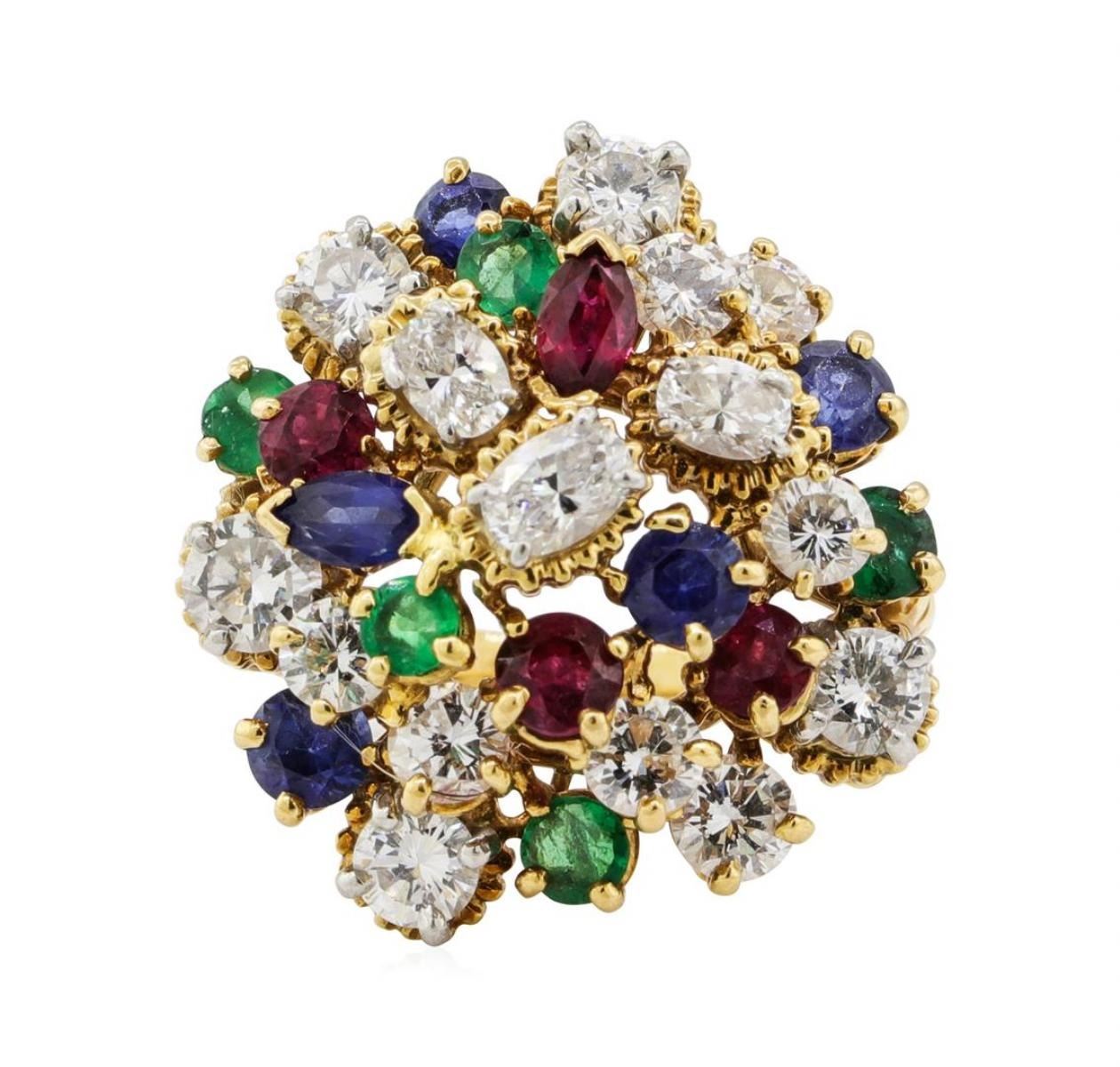 One electronically tested platinum and 18KT yellow gold lady's hand fabricated fashion ring with a wire cluster motif with a bright polish finish. The featured lady's ring has a hand twisted wire double shank measuring 2.50 millimeters wide. Identified with markings of '18K / PLAT'. Condition is used, good workmanship. Containing: Three prong set round modified brilliant cut natural rubies, measuring 3.80 - 3.50 x 2.37 mm, (depth est.) approximate total weight of 0.81ct., clarity is moderately included, medium dark, strong, red color, (GIA R 6/5), cut is good. Transmitting light somewhat diffusely, transparent to translucent. Naturally occurring internal & external characteristics are present. Colored gemstones are presumed to have been subjected to commonly used enhancement processes. Graded in the setting. One prong set marquise modified brilliant cut natural ruby, measuring 5.60 x 3.10 x 2.02mm, (depth est.) approximate weight of 0.25ct., clarity is eye clean, medium, strong, orangy red color, (GIA oR 5/5), cut is very good. Transmitting light with no distortion, transparent. Colored gemstones are presumed to have been subjected to commonly used enhancement processes. Graded in the setting. Four prong set round modified brilliant cut natural blue sapphires, measuring 4.00 - 3.50 x 2.44 mm, (depth est.) approximate total weight of 1.25ct., clarity is slightly included, medium, moderately strong, blue color, (GIA B 5/4), cut is good. Transmitting light with a minimum of distortion, transparent. Colored gemstones are presumed to have been subjected to commonly used enhancement processes. Graded in the setting. One prong set marquise modified brilliant cut natural blue sapphire, measuring 5.40 x 3.00 x 1.95mm, (depth est.) approximate weight of 0.24ct., clarity is eye clean, medium dark, moderately strong, blue color, (GIA B 6/4), cut is good. Transmitting light with no distortion, transparent. Colored gemstones are presumed to have been subjected to commonly used enhancement processes. Graded in the setting. Five prong set round modified brilliant cut natural emeralds, measuring 3.40 - 3.20 x 2.15 mm, (depth est.) approximate total weight of 0.70 ct., clarity is moderately included, medium, very slightly grayish, green color, (GIA G 5/3), cut is good. Transmitting light somewhat diffusely, transparent to translucent. Naturally occurring internal & external characteristics are present. Indications of oil residue. Colored gemstones are presumed to have been subjected to commonly used enhancement processes. Graded in the setting. Three prong set oval shaped cut diamonds, measuring 4.80 x 3.35 x 2.56mm (depth est.) approximate total weight of 3 Stones = 0.80 ct. Graded in the setting. Color G - H Clarity VS-2 to SI-1 Cut Good Twelve prong set round brilliant cut diamonds, measuring 4.40 - 3.80 x 2.46mm (depth est.) approximate total weight of 12 Stones = 3.03ct. Graded in the setting. Color H - I Clarity VS-2 to SI-1 Cut Good. Total Weight of Colored Stones 3.25ct.. Total Weight of Diamonds 3.83ct.. Total Weight of Ring 13.80gm GAS Appraised at $11175.00. GAS Appraised.