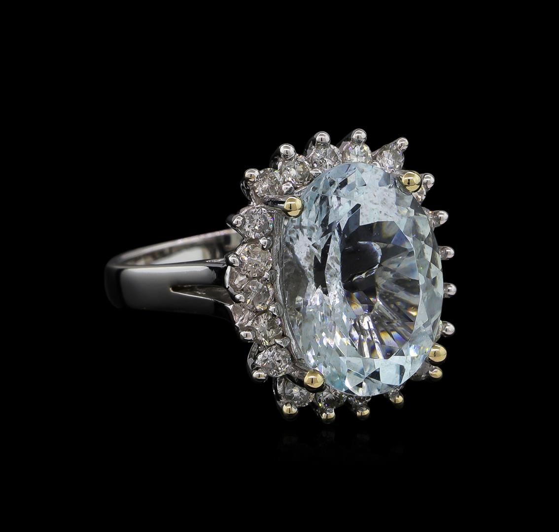 One electronically tested 14KT white gold lady's cast fashion ring with a basket halo with a bright polish finish. The featured lady's ring has a shank measuring 2.48 millimeters wide. Trademark is Orianne. Identified with markings of "14K". Condition is new, good workmanship. Containing: One prong set oval modified brilliant cut natural aquamarine, measuring 15.04 x 11.11 x 7.90mm, approximate weight of 7.08ct., clarity is slightly included, type I, light, moderately strong, very slightly greenish blue color, (GIA vslgB 3/4), cut is good. Transmitting light with no distortion, transparent. Colored gemstones are presumed to have been subjected to commonly used enhancement processes. Graded in the setting. Twenty prong set round brilliant cut diamonds, measuring 2.10 - 2.00 x 1.27mm (depth est.) approximate total weight of 20 Stones = 0.66ct. Graded in the setting. Clarity: SI-2 to I-1. Color: H - I. Cut Good. Total Weight of Colored Stones 7.08ct. Total Weight of Diamonds 0.66ct. Total Weight of Ring 7.20gm. GAS Appraised at $11,145.00.