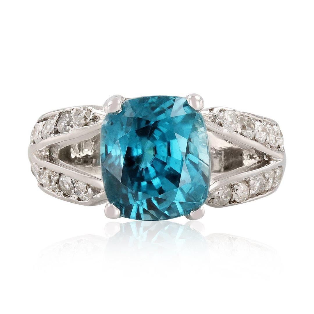 7.09ctw Blue Zircon and 0.30ctw Diamond 14K White Gold Ring. One electronically tested 14KT white gold ladies cast zircon and diamond ring with a bright polish finish. Condition is new, good workmanship. The feature zircon is supported by diamond set split shoulders, completed by a grooved three and one-half millimeter wide band. Identified with markings of "K14". Containing: One prong set rectangular cushion mixed cut natural blue zircon, measuring 9.75 x 8.50 x 7.45mm, 6% bulge factor, approximate weight of 7.09ct., clarity is eye clean, type I, medium dark, moderately strong, very strongly greenish blue color, (GIA vstgB 6/4), cut is good. Transmitting light with no distortion, transparent. Colored Stone Grading Report attached. Graded in the setting. Twenty prong set round brilliant cut diamonds approximate total weight of 20 Stones = 0.30ct. Graded in the setting. Clarity I-2 to I-3 Color G - I Total Weight of Colored Stones 7.09ct. Total Weight of Diamonds 0.30ct. Total Weight of Ring 6.73 gm