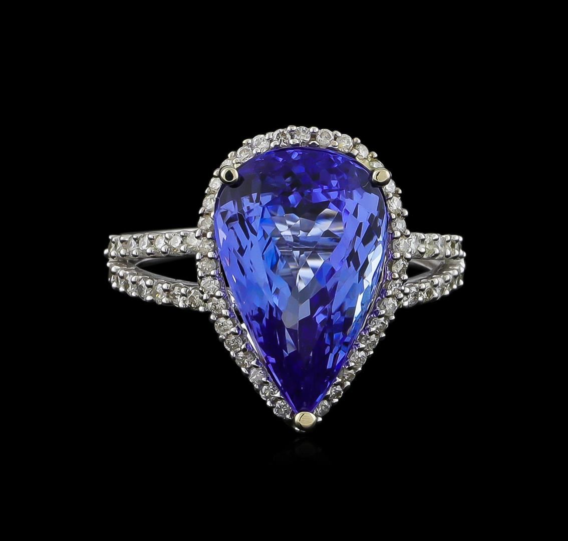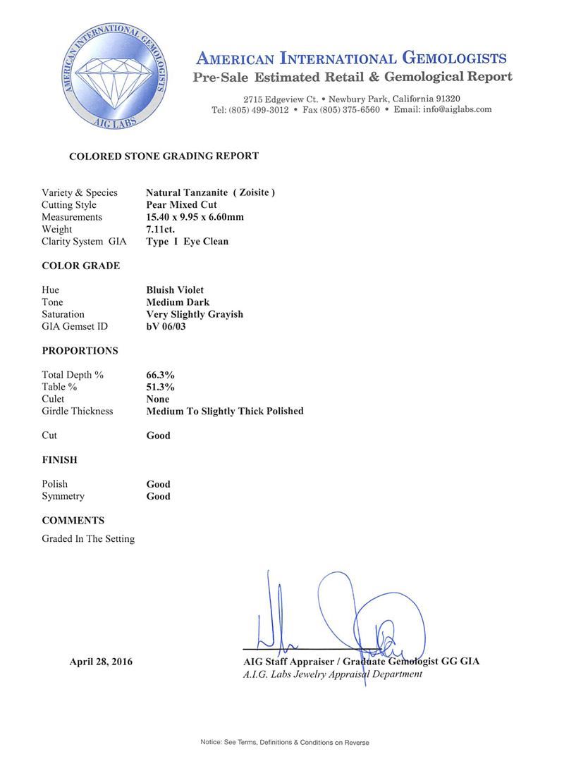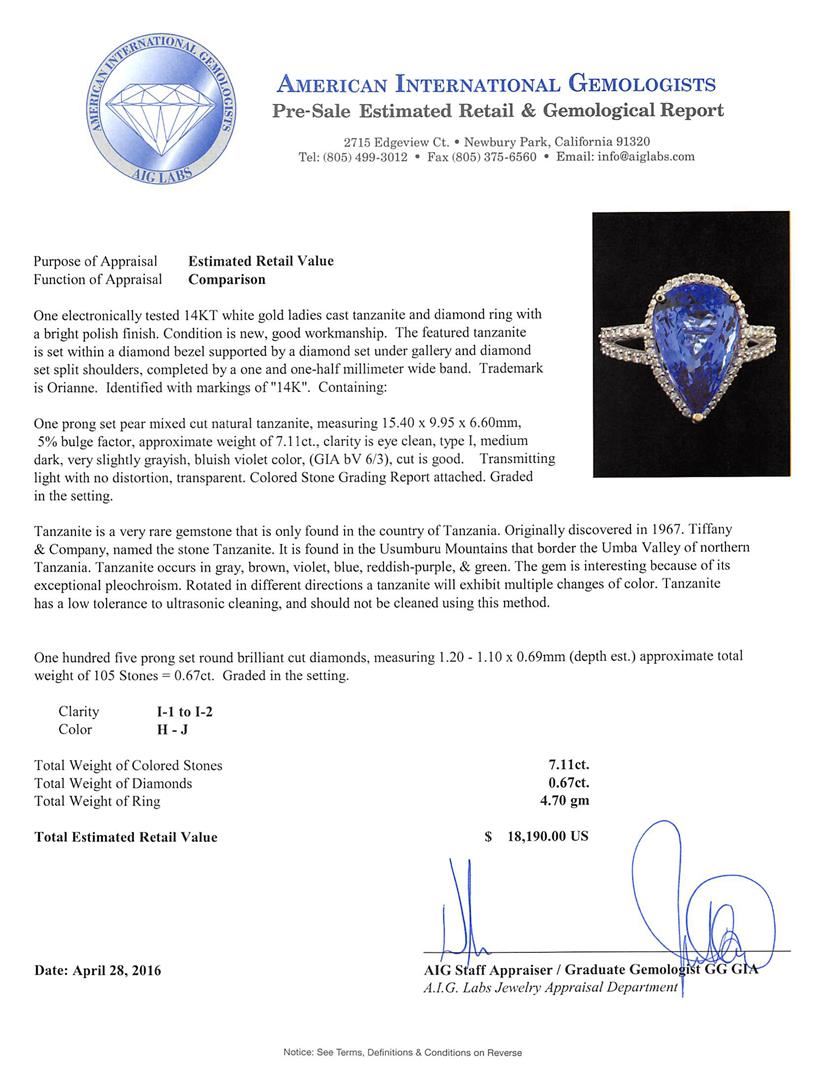 One electronically tested 14KT white gold ladies cast tanzanite and diamond ring with a bright polish finish. The featured tanzanite is set within a diamond bezel supported by a diamond set under gallery and diamond set split shoulders, completed by a one and one-half millimeter wide band. Trademark is Orianne. Identified with markings of "14K". Condition is new, good workmanship. Containing: One prong set pear mixed cut natural tanzanite, measuring 15.40 x 9.95 x 6.60mm, 5%. bulge factor, approximate weight of 7.11ct., clarity is eye clean, type I, medium dark, very slightly grayish, bluish violet color, (GIA bV 6/3), cut is good. Transmitting light with no distortion, transparent. Colored Stone Grading Report attached. Graded in the setting. Tanzanite is a very rare gemstone that is only found in the country of Tanzania. Originally discovered in 1967. Tiffany & Company, named the stone Tanzanite. It is found in the Usumburu Mountains that border the Umba Valley of northern Tanzania. Tanzanite occurs in gray, brown, violet, blue, reddish-purple, & green. The gem is interesting because of its exceptional pleochroism. Rotated in different directions a tanzanite will exhibit multiple changes of color. Tanzanite has a low tolerance to ultrasonic cleaning, and should not be cleaned using this method. One Hundred Five prong set round brilliant cut diamonds, measuring 1.20 - 1.10 x 0.69mm (depth est.) approximate total weight of 105 Stones = 0.67ct. Graded in the setting. Clarity: I-1 to I-2. Color: H - J. Total Weight of Colored Stones 7.11ct. Total Weight of Diamonds 0.67ct. Total Weight of Ring 4.70gm. AIG Appraised at $18,190.00.