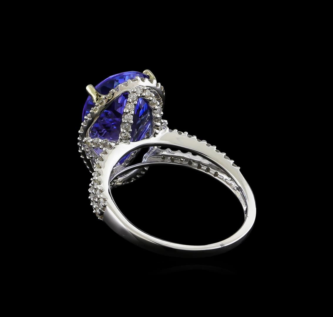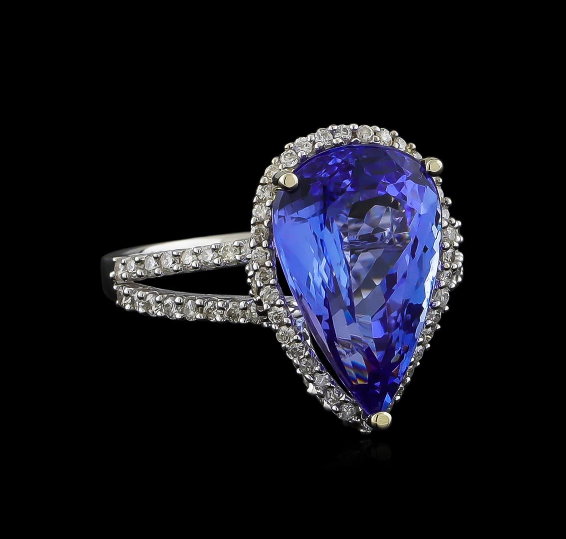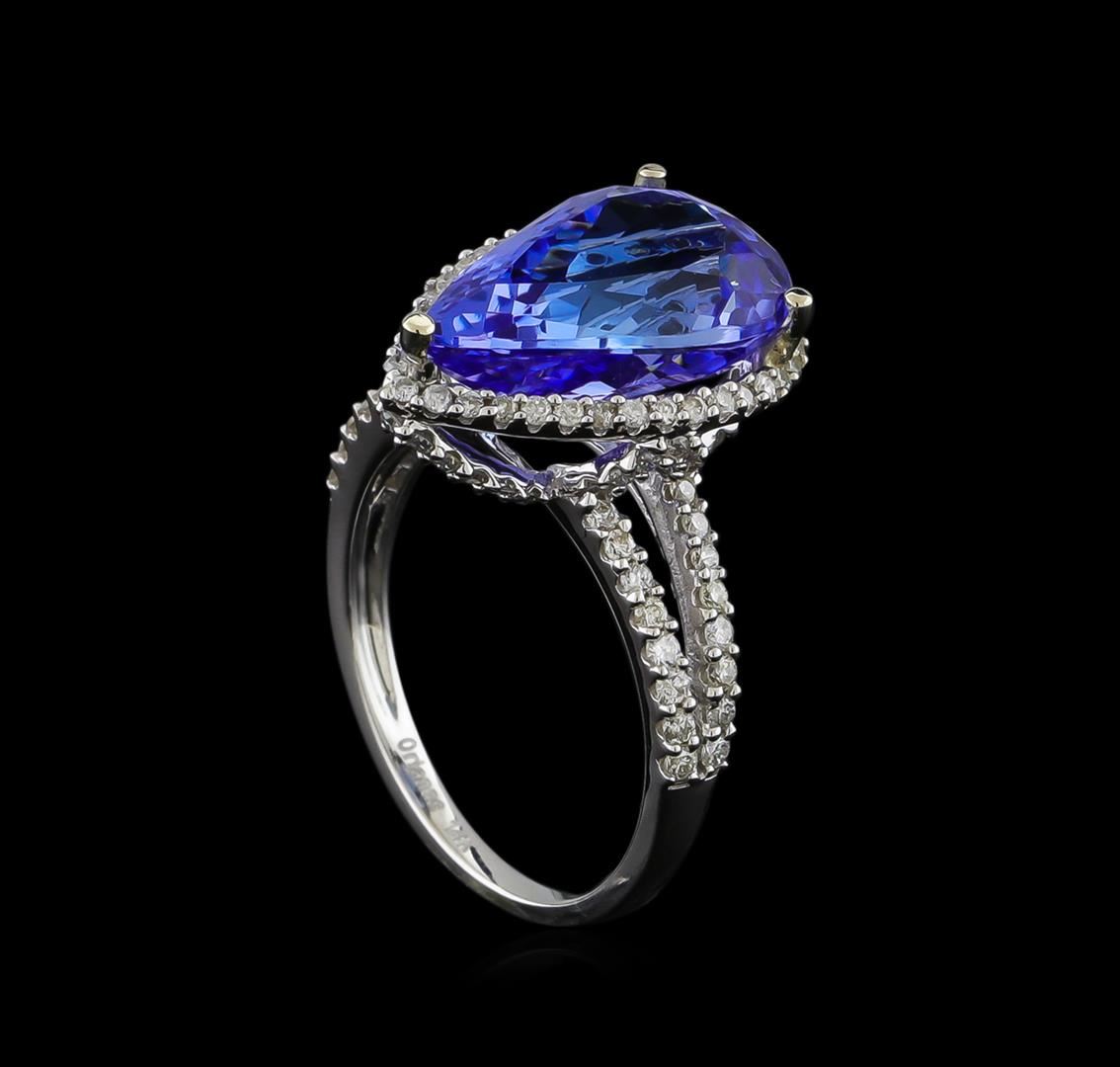 One electronically tested 14KT white gold ladies cast tanzanite and diamond ring with a bright polish finish. The featured tanzanite is set within a diamond bezel supported by a diamond set under gallery and diamond set split shoulders, completed by a one and one-half millimeter wide band. Trademark is Orianne. Identified with markings of "14K". Condition is new, good workmanship. Containing: One prong set pear mixed cut natural tanzanite, measuring 15.40 x 9.95 x 6.60mm, 5%. bulge factor, approximate weight of 7.11ct., clarity is eye clean, type I, medium dark, very slightly grayish, bluish violet color, (GIA bV 6/3), cut is good. Transmitting light with no distortion, transparent. Colored Stone Grading Report attached. Graded in the setting. Tanzanite is a very rare gemstone that is only found in the country of Tanzania. Originally discovered in 1967. Tiffany & Company, named the stone Tanzanite. It is found in the Usumburu Mountains that border the Umba Valley of northern Tanzania. Tanzanite occurs in gray, brown, violet, blue, reddish-purple, & green. The gem is interesting because of its exceptional pleochroism. Rotated in different directions a tanzanite will exhibit multiple changes of color. Tanzanite has a low tolerance to ultrasonic cleaning, and should not be cleaned using this method. One Hundred Five prong set round brilliant cut diamonds, measuring 1.20 - 1.10 x 0.69mm (depth est.) approximate total weight of 105 Stones = 0.67ct. Graded in the setting. Clarity: I-1 to I-2. Color: H - J. Total Weight of Colored Stones 7.11ct. Total Weight of Diamonds 0.67ct. Total Weight of Ring 4.70gm. AIG Appraised at $18,190.00.
