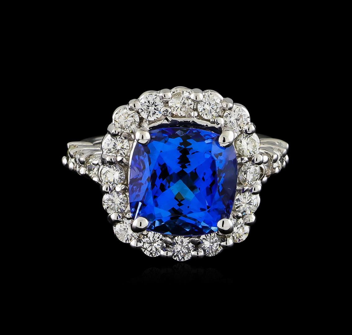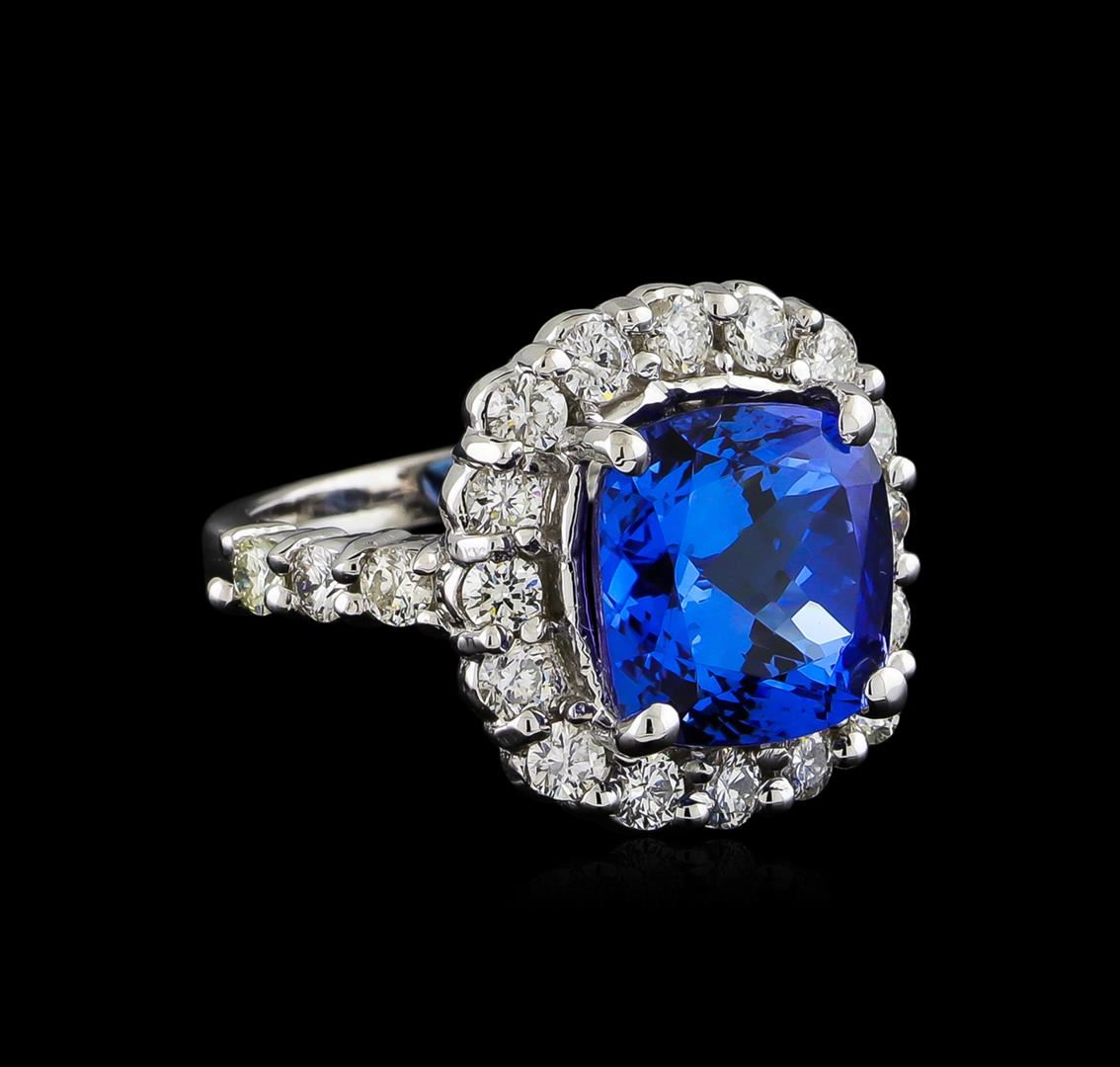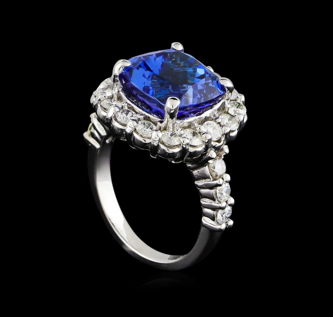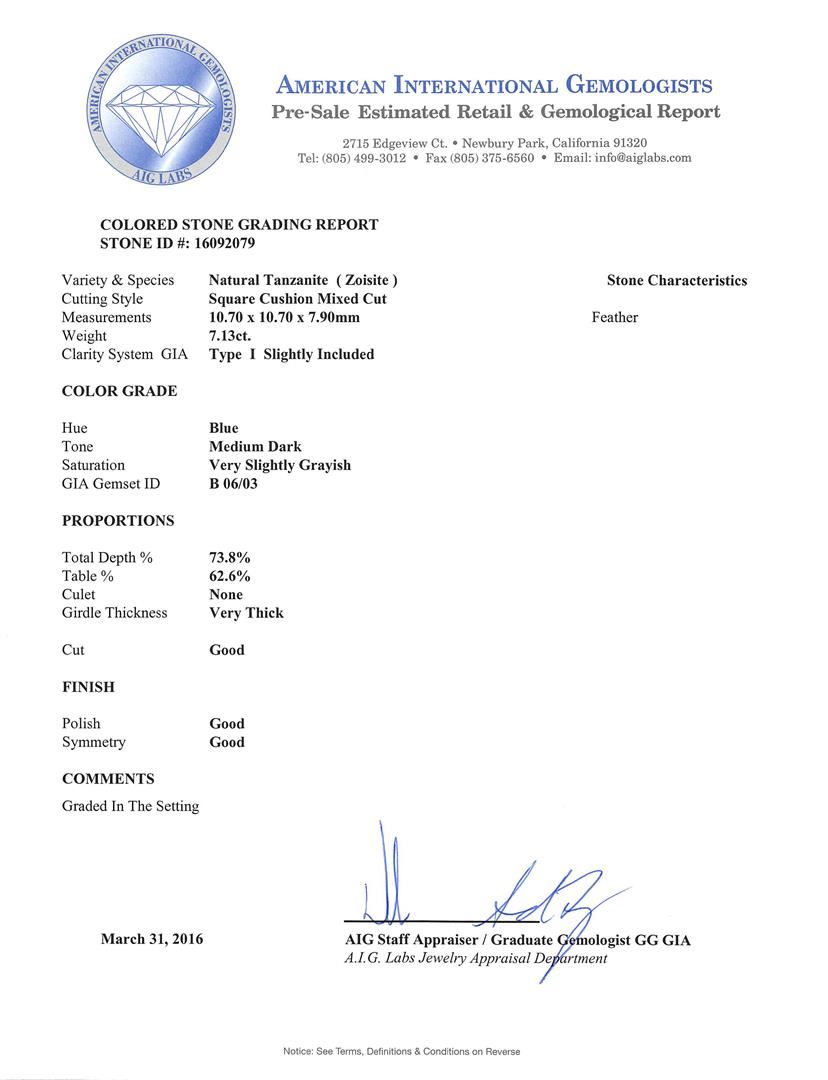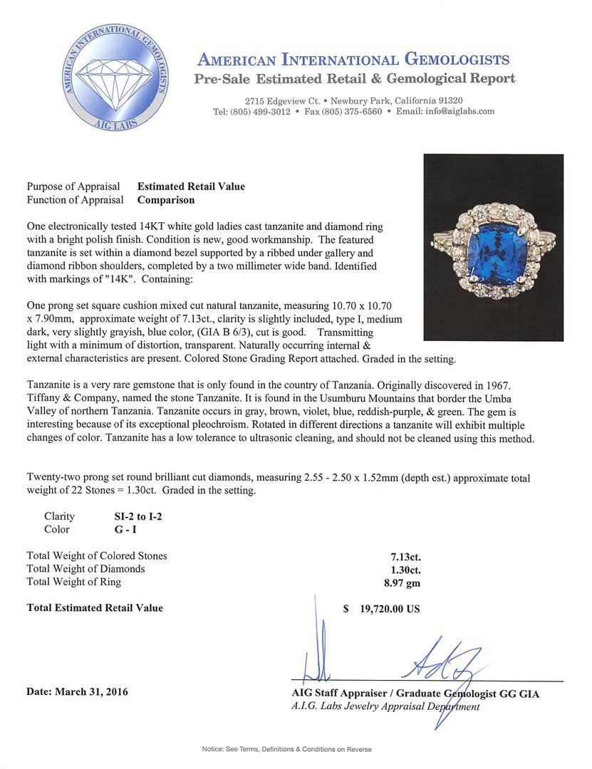 One electronically tested 14KT white gold ladies cast tanzanite and diamond ring with a bright polish finish. The featured tanzanite is set within a diamond bezel supported by a ribbed under gallery and diamond ribbon shoulders, completed by a two millimeter wide band. Identified with markings of "14K". Condition is new, good workmanship. Containing: One prong set square cushion mixed cut natural tanzanite, measuring 10.70 x 10.70 x 7.90mm, approximate weight of 7.13ct., clarity is slightly included, type I, medium dark, very slightly grayish, blue color, (GIA B 6/3), cut is good. Transmitting light with a minimum of distortion, transparent. Naturally occurring internal & external characteristics are present. Colored Stone Grading Report attached. Graded in the setting. Tanzanite is a very rare gemstone that is only found in the country of Tanzania. Originally discovered in 1967. Tiffany & Company, named the stone Tanzanite. It is found in the Usumburu Mountains that border the Umba Valley of northern Tanzania. Tanzanite occurs in gray, brown, violet, blue, reddish-purple, & green. The gem is interesting because of its exceptional pleochroism. Rotated in different directions a tanzanite will exhibit multiple changes of color. Tanzanite has a low tolerance to ultrasonic cleaning, and should not be cleaned using this method. Twenty-Two prong set round brilliant cut diamonds, measuring 2.55 - 2.50 x 1.52mm (depth est.) approximate total weight of 22 Stones = 1.30ct. Graded in the setting. Clarity: SI-2 to I-2. Color: G - I. Total Weight of Colored Stones 7.13ct. Total Weight of Diamonds 1.30ct. Total Weight of Ring 8.97gm. AIG Appraised at $19,720.00.