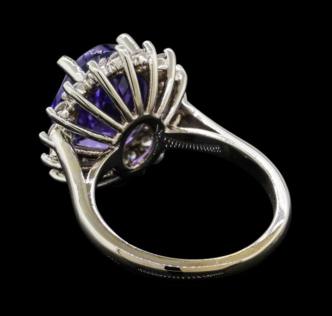 One electronically tested 14KT white gold lady's cast fashion ring with a basket halo with a bright polish finish. The featured lady's ring has a shank measuring 2.18 millimeters wide. Identified with markings of '14K'. Condition is new, good workmanship. Containing: One prong set oval modified brilliant cut natural tanzanite, measuring 12.55 x 9.78 x 7.85mm, (depth est.) 5%. bulge factor, approximate weight of 7.13ct., clarity is eye clean, medium dark, moderately strong, violetish blue color, (GIA vB 6/4), cut is excellent. Transmitting light with no distortion, transparent. Colored gemstones are presumed to have been subjected to commonly used enhancement processes. Graded in the setting. Sixteen prong set round brilliant cut diamonds, measuring 2.40 - 2.35 x 1.48mm (depth est.) approximate total weight of 16 Stones = 0.82ct. Graded in the setting. Clarity SI-1 to SI-2. Color: H - I Cut Good. Total Weight of Colored Stones 7.13ct.. Total Weight of Diamonds 0.82ct.. Total Weight of Ring 6.80gm. GAS Appraised at $13,170.00.