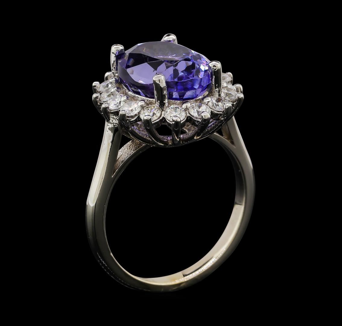 One electronically tested 14KT white gold lady's cast fashion ring with a basket halo with a bright polish finish. The featured lady's ring has a shank measuring 2.18 millimeters wide. Identified with markings of '14K'. Condition is new, good workmanship. Containing: One prong set oval modified brilliant cut natural tanzanite, measuring 12.55 x 9.78 x 7.85mm, (depth est.) 5%. bulge factor, approximate weight of 7.13ct., clarity is eye clean, medium dark, moderately strong, violetish blue color, (GIA vB 6/4), cut is excellent. Transmitting light with no distortion, transparent. Colored gemstones are presumed to have been subjected to commonly used enhancement processes. Graded in the setting. Sixteen prong set round brilliant cut diamonds, measuring 2.40 - 2.35 x 1.48mm (depth est.) approximate total weight of 16 Stones = 0.82ct. Graded in the setting. Clarity SI-1 to SI-2. Color: H - I Cut Good. Total Weight of Colored Stones 7.13ct.. Total Weight of Diamonds 0.82ct.. Total Weight of Ring 6.80gm. GAS Appraised at $13,170.00.