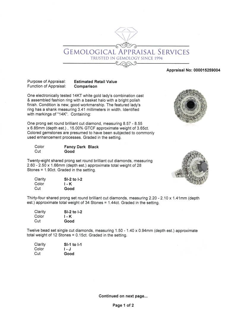 One electronically tested 14KT white gold lady's combination cast & assembled fashion ring with a basket halo with a bright polish finish. The featured lady's ring has a shank measuring 3.41 millimeters in width. Identified with markings of "14K". Condition is new, good workmanship. Containing: One prong set round brilliant cut diamond, measuring 8.57 - 8.55 x 6.85mm (depth est.) , 15.00.%. GTCF approximate weight of 3.65ct. Colored gemstones are presumed to have been subjected to commonly used enhancement processes. Graded in the setting. Cut Good Twenty-Eight shared prong set round brilliant cut diamonds, measuring 2.60 - 2.50 x 1.66mm (depth est.) approximate total weight of 28 Stones = 1.90ct. Graded in the setting. Clarity: SI-2 to I-2. Color: I - K. Cut Good Thirty-Four shared prong set round brilliant cut diamonds, measuring 2.20 - 2.10 x 1.41mm (depth est.) approximate total weight of 34 Stones = 1.44ct. Graded in the setting. Clarity: SI-2 to I-2. Color: I - Good Twelve bead set single cut diamonds, measuring 1.50 - 1.40 x 0.94mm (depth est.) approximate total weight of 12 Stones = 0.15ct. Graded in the setting. Clarity: SI-1 to I-1. Color: I - Good. Total Weight of Diamonds 7.14ct. Total Weight of Ring 15.40gm. GAS Appraised at $6,845.00.