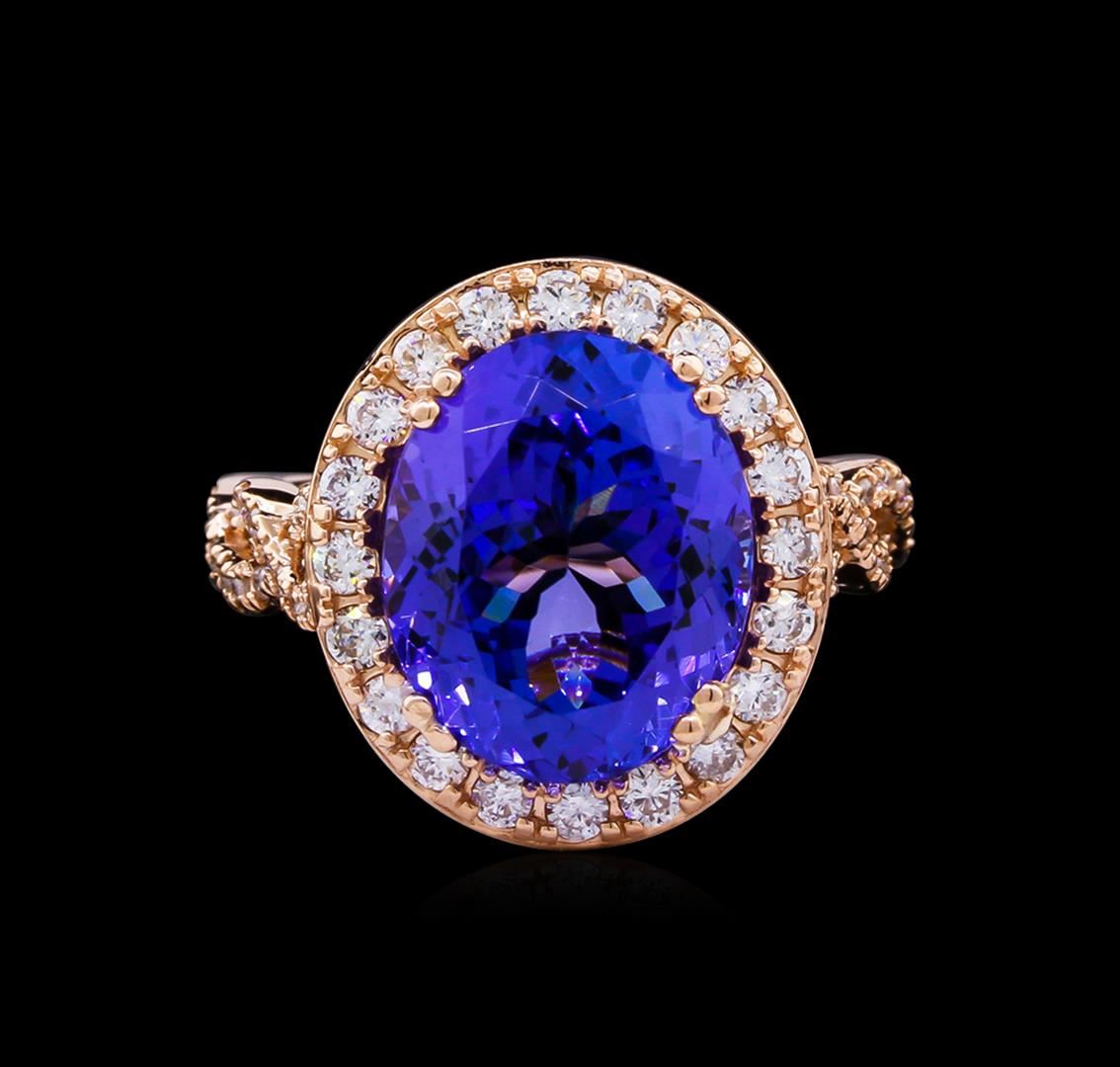 One electronically tested 14KT rose gold lady's cast fashion ring with a crossover split shank with a bright polish finish. The featured lady's ring has a shank measuring 2.80 millimeters wide. Identified with markings of "K14". Condition is new, good workmanship. Containing: One prong set oval modified brilliant cut natural tanzanite, measuring 13.00 x 10.76 x 7.16mm, approximate weight of 7.15ct., clarity is eye clean, type I, medium dark, moderately strong, violetish blue color, (GIA vB 6/4), cut is excellent. Transmitting light with no distortion, transparent. Colored gemstones are presumed to have been subjected to commonly used enhancement processes. Graded in the setting. Twenty prong set round brilliant cut diamonds, measuring 1.90 - 1.80 x 1.15mm (depth est.) approximate total weight of 20 Stones = 0.48ct. Graded in the setting. Clarity: SI-1 to SI-2. Color: H - I. Cut Good Seventy-Six prong set round brilliant cut diamonds, measuring 1.10 - 1.05 x 0.68mm (depth est.) approximate total weight of 76 Stones = 0.38ct. Graded in the setting. Clarity: SI-2 to I-1. Color: H - I. Cut Good. Total Weight of Colored Stones 7.15ct. Total Weight of Diamonds 0.86ct. Total Weight of Ring 7.80gm. GAS Appraised at $16,095.00.