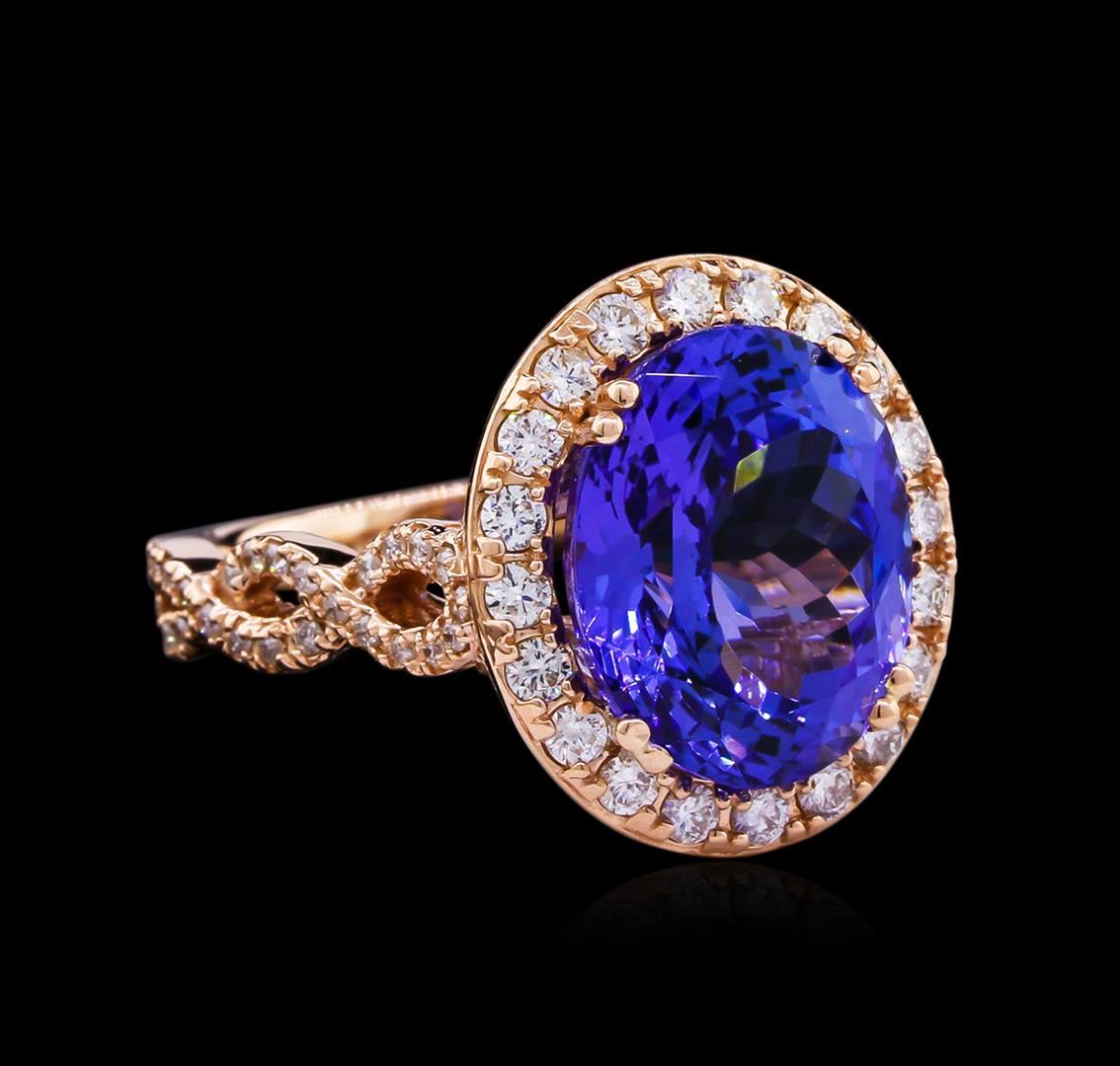 One electronically tested 14KT rose gold lady's cast fashion ring with a crossover split shank with a bright polish finish. The featured lady's ring has a shank measuring 2.80 millimeters wide. Identified with markings of "K14". Condition is new, good workmanship. Containing: One prong set oval modified brilliant cut natural tanzanite, measuring 13.00 x 10.76 x 7.16mm, approximate weight of 7.15ct., clarity is eye clean, type I, medium dark, moderately strong, violetish blue color, (GIA vB 6/4), cut is excellent. Transmitting light with no distortion, transparent. Colored gemstones are presumed to have been subjected to commonly used enhancement processes. Graded in the setting. Twenty prong set round brilliant cut diamonds, measuring 1.90 - 1.80 x 1.15mm (depth est.) approximate total weight of 20 Stones = 0.48ct. Graded in the setting. Clarity: SI-1 to SI-2. Color: H - I. Cut Good Seventy-Six prong set round brilliant cut diamonds, measuring 1.10 - 1.05 x 0.68mm (depth est.) approximate total weight of 76 Stones = 0.38ct. Graded in the setting. Clarity: SI-2 to I-1. Color: H - I. Cut Good. Total Weight of Colored Stones 7.15ct. Total Weight of Diamonds 0.86ct. Total Weight of Ring 7.80gm. GAS Appraised at $16,095.00.