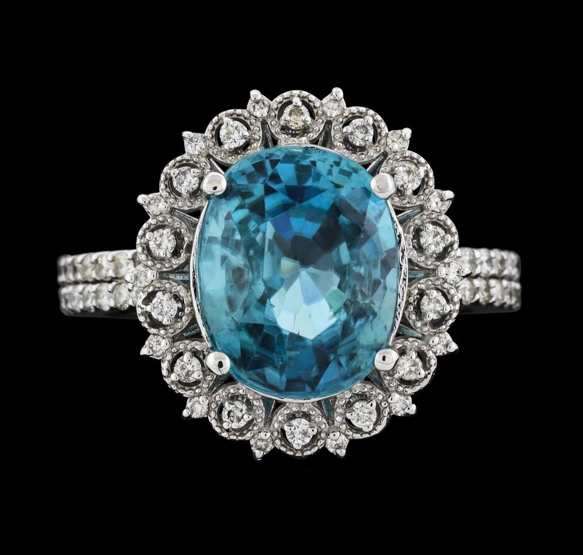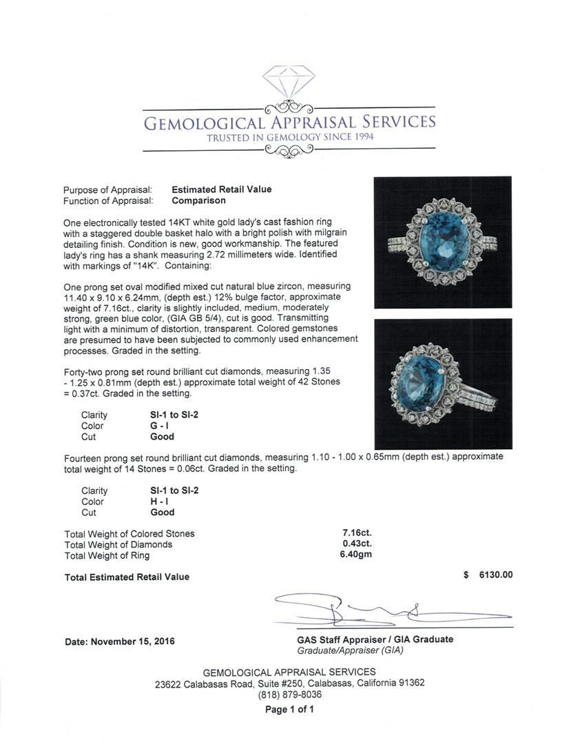 One electronically tested 14KT white gold lady's cast fashion ring with a staggered double basket halo with a bright polish with milgrain detailing finish. The featured lady's ring has a shank measuring 2.72 millimeters wide. Identified with markings of '14K'. Condition is new, good workmanship. Containing: One prong set oval modified mixed cut natural blue zircon, measuring 11.40 x 9.10 x 6.24mm, (depth est.) 12%. bulge factor, approximate weight of 7.16ct., clarity is slightly included, medium, moderately strong, green blue color, (GIA GB 5/4), cut is good. Transmitting light with a minimum of distortion, transparent. Colored gemstones are presumed to have been subjected to commonly used enhancement processes. Graded in the setting. Forty-Two prong set round brilliant cut diamonds, measuring 1.35 - 1.25 x 0.81mm (depth est.) approximate total weight of 42 Stones = 0.37ct. Graded in the setting. Clarity SI-1 to SI-2. Color: G - I Cut Good Fourteen prong set round brilliant cut diamonds, measuring 1.10 - 1.00 x 0.65mm (depth est.) approximate total weight of 14 Stones = 0.06ct. Graded in the setting. Clarity SI-1 to SI-2. Color: H - I Cut Good. Total Weight of Colored Stones 7.16ct.. Total Weight of Diamonds 0.43ct.. Total Weight of Ring 6.40gm. GAS Appraised at $6,130.00.