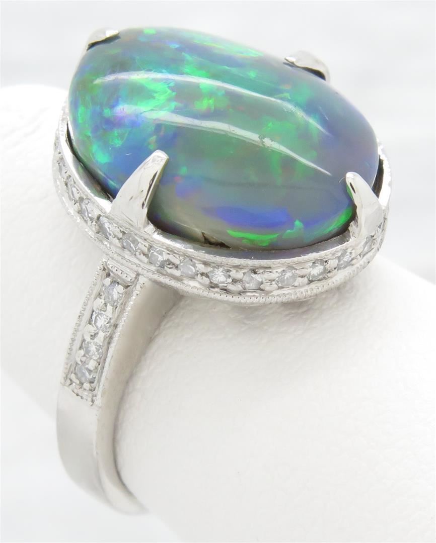 One tested 18K white gold opal and diamond ring. Containing: One Australian Black Opal measuring 14.5MM X 11.6MM. Size: 7.18CT, The play of color in this opal is a strong multi flash covering the entire stone with vivid yellow, green, red, orange and blue on a dark base. Round Brilliant Cut Diamonds. Approximate total diamond weight: .30CTW. All diamonds are graded in the mounting unless otherwise stated. Weight of ring: 7.4 grams, Size: 4.25.