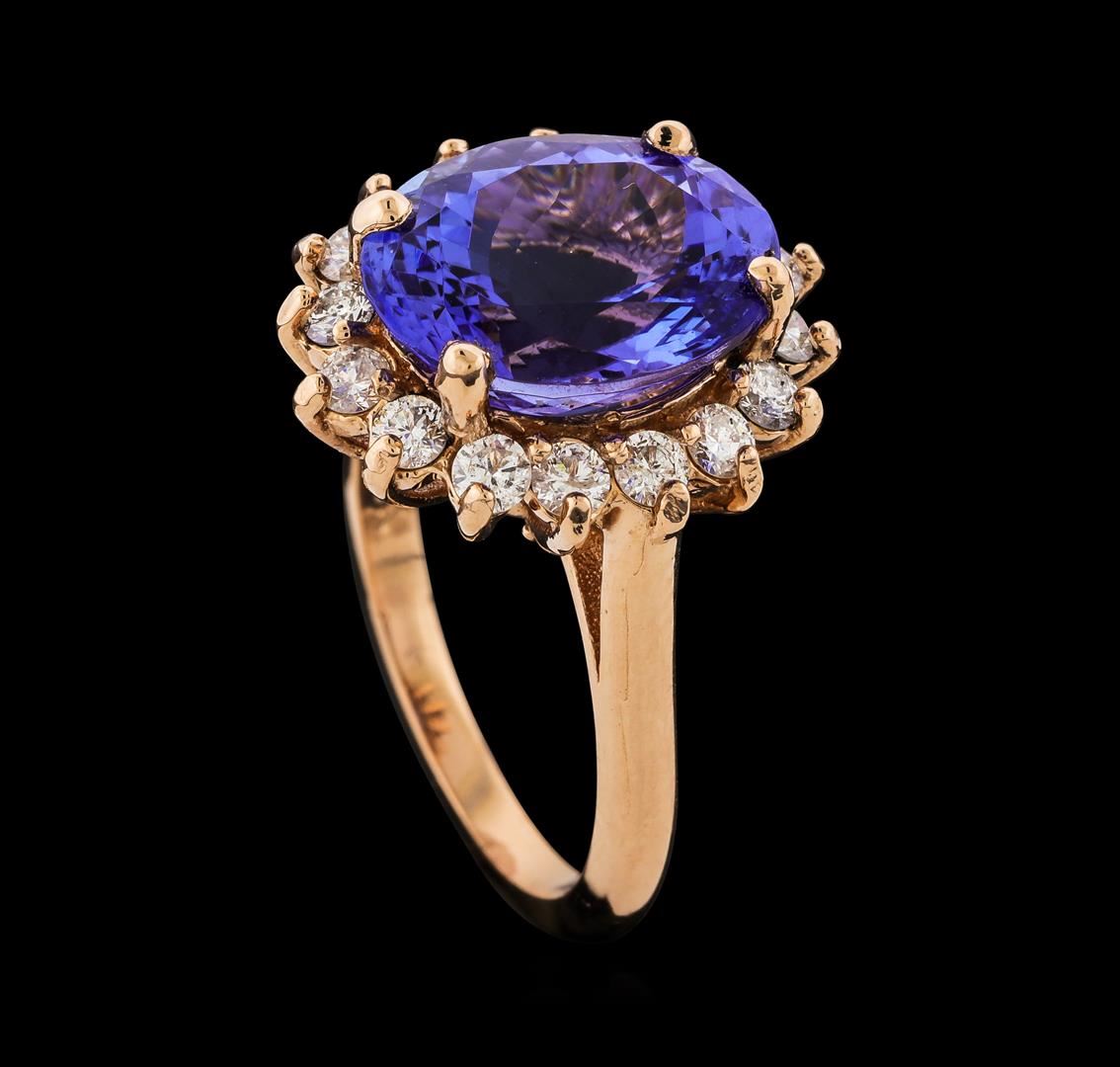 One electronically tested 14KT rose gold lady's cast fashion ring with a basket halo with a bright polish finish. The featured lady's ring has a shank measuring 1.96 millimeters wide. Identified with markings of '14K'. Condition is new, good workmanship. Containing: One prong set oval modified brilliant cut natural tanzanite, measuring 13.03 x 10.76 x 7.29mm, (depth est.) approximate weight of 7.19ct., clarity is eye clean, medium, moderately strong, violetish blue color, (GIA vB 5/4), cut is very good. Transmitting light with no distortion, transparent. Colored gemstones are presumed to have been subjected to commonly used enhancement processes. Graded in the setting. Sixteen prong set round brilliant cut diamonds, measuring 2.40 - 2.35 x 1.45mm (depth est.) approximate total weight of 16 Stones = 0.80ct. Graded in the setting. Clarity SI-1 to I-1. Color: G - H Cut Good. Total Weight of Colored Stones 7.19ct.. Total Weight of Diamonds 0.80ct.. Total Weight of Ring 7.00gm GAS Appraised at $12,040.00.
