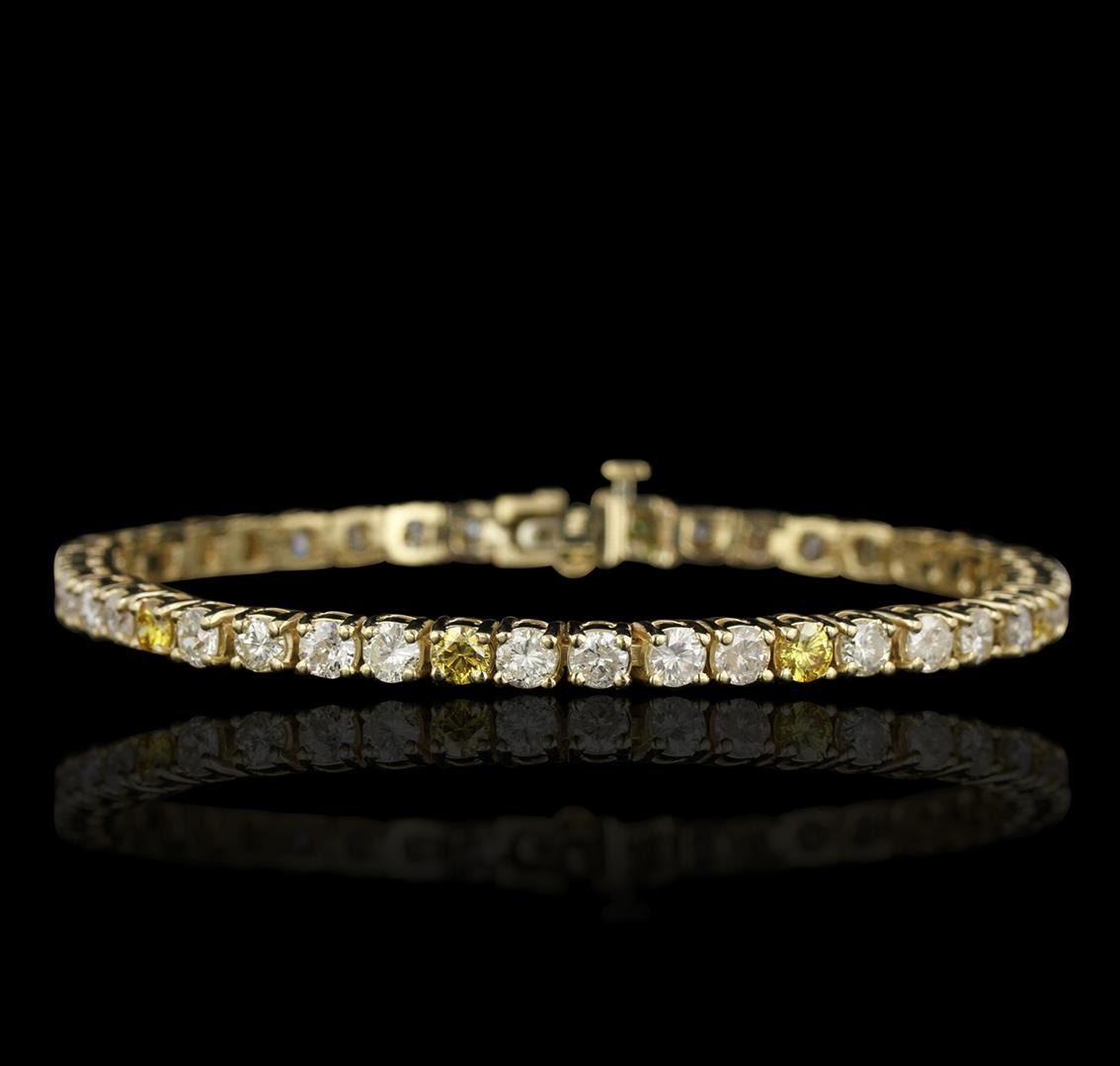 One electronically tested 14KT yellow gold lady's combination cast & assembled tennis bracelet with a tongue clasp & foldover safety with a bright polish finish. Condition is like new, good workmanship. The featured lady's tennis bracelet measures approximately 7 inches in length. Identified with markings of 14K. Containing: Eight prong set round brilliant cut diamonds, measuring 3.65 - 3.50 x 2.26mm (depth est.) approximate total weight of 8 Stones = 1.40ct. The featured yellow diamonds have been treated to enhance their color. Graded in the setting. Clarity: VS-2 to SI-1. Color: Fancy yellow. Cut: Very good. Thirty-four prong set round brilliant cut diamonds, measuring 3.65 - 3.30 x 2.19mm (depth est.) approximate total weight of 34 Stones = 5.50ct. Graded in the setting. Clarity: SI-1 to I-2. Color: H-J. Cut: Good. Two prong set round brilliant cut diamonds, measuring 3.35 - 3.24 x 2.18mm (depth est.) approximate total weight of 2 Stones = 0.30ct. Graded in the setting. Clarity: SI-2 to I-1. Color: O-P. Cut: Good. Total Weight of Diamonds: 7.20ct. Total Weight of Bracelet: 17.70 grams. GAS Appraised at $13,825.00.