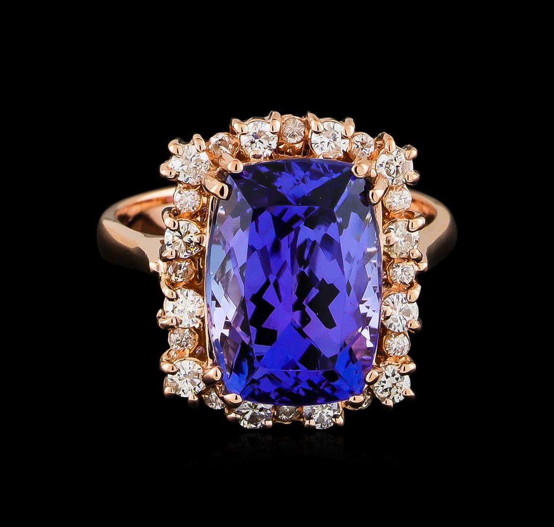 One electronically tested 14KT rose gold ladies cast tanzanite and diamond ring with a bright polish finish. The featured tanzanite is set within a diamond bezel supported by a ribbed under gallery, completed by a two millimeter wide band. Identified with markings of "K14". Condition is new, good workmanship. Containing: One prong set rectangular cushion mixed cut natural tanzanite, measuring 13.10 x 9.30 x 7.50mm, approximate weight of 7.20ct., clarity is eye clean, type I, medium dark, very slightly grayish, bluish violet color, (GIA bV 6/3), cut is good. Transmitting light with no distortion, transparent. Colored Stone Grading Report attached. Graded in the setting. Tanzanite is a very rare gemstone that is only found in the country of Tanzania. Originally discovered in 1967. Tiffany & Company, named the stone Tanzanite. It is found in the Usumburu Mountains that border the Umba Valley of northern Tanzania. Tanzanite occurs in gray, brown, violet, blue, reddish-purple, & green. The gem is interesting because of its exceptional pleochroism. Rotated in different directions a tanzanite will exhibit multiple changes of color. Tanzanite has a low tolerance to ultrasonic cleaning, and should not be cleaned using this method. Twelve prong set round brilliant cut diamonds, measuring 2.00 - 2.00 x 1.20mm (depth est.) approximate total weight of 12 Stones = 0.35ct. Graded in the setting. Clarity: I-1 to I-2. Color: G - I. Twelve prong set round brilliant cut diamonds, measuring 1.40 - 1.40 x 0.84mm (depth est.) approximate total weight of 12 Stones = 0.12ct. Graded in the setting. Clarity: SI-2 to I-2. Color: G - I. Total Weight of Colored Stones 7.20ct. Total Weight of Diamonds 0.47ct. Total Weight of Ring 6.33gm. AIG Appraised at $17,620.00.