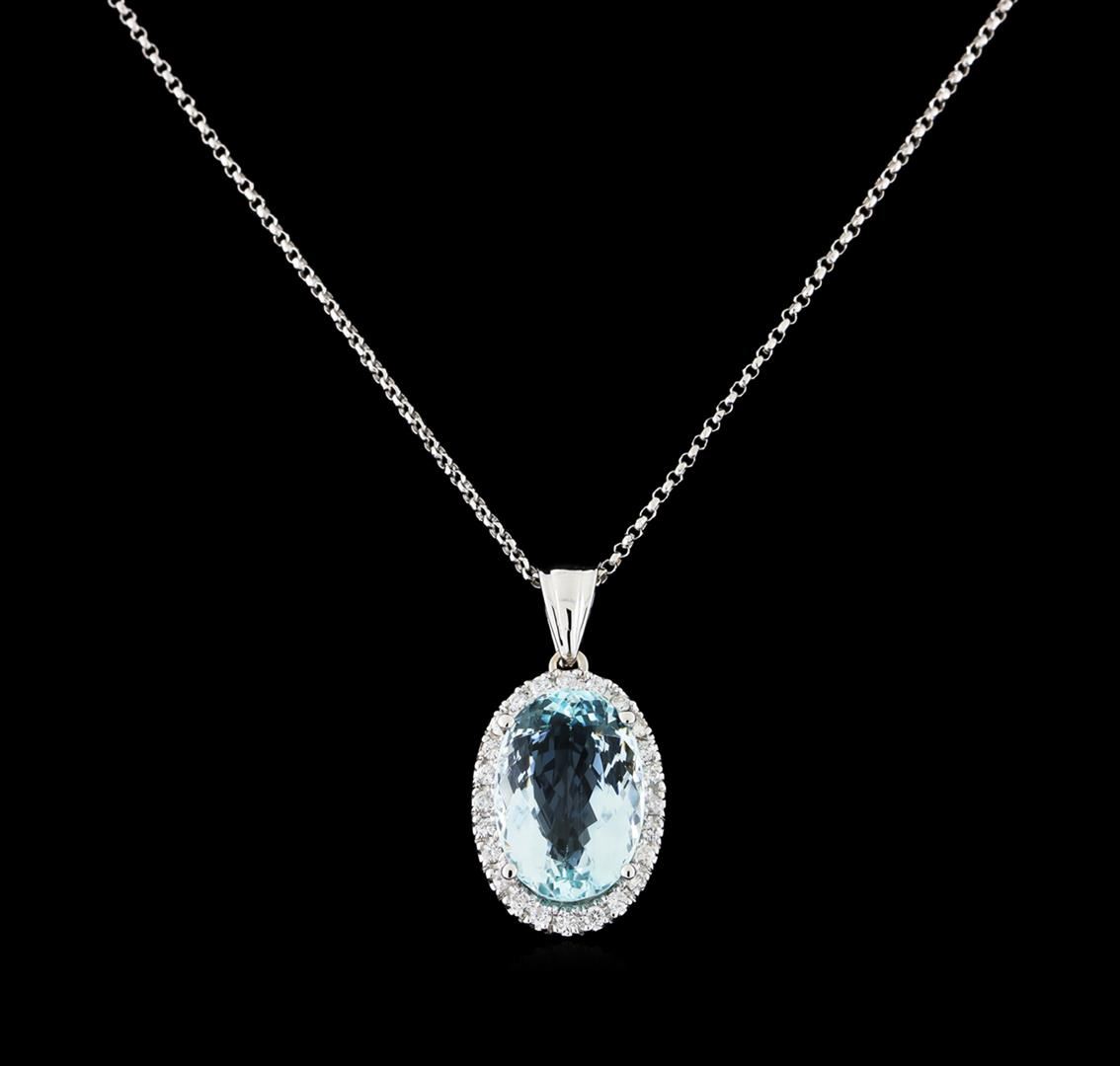 One Pendant With Chain featuring: 14KT White Gold weighing 3.55 grams containing one Aquamarine center stone with a total weight of 7.21ct and Diamonds with a total weight of 0.3ct.