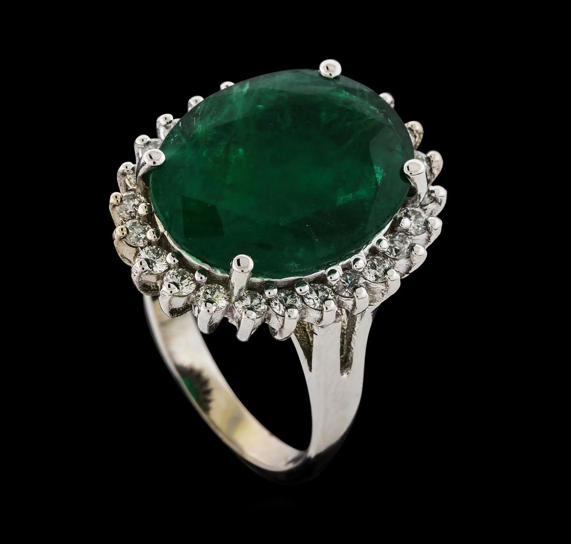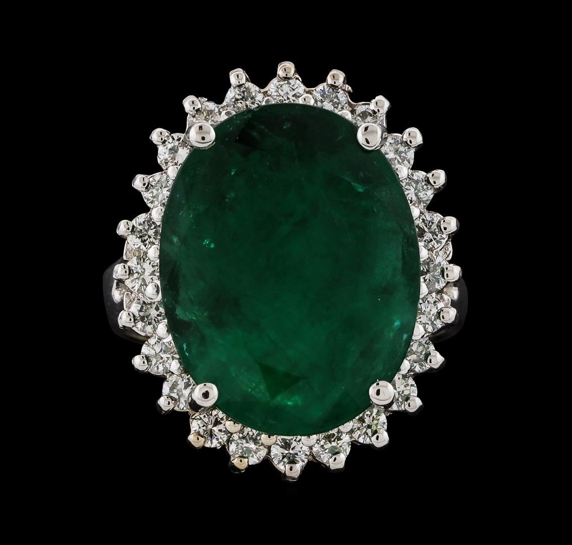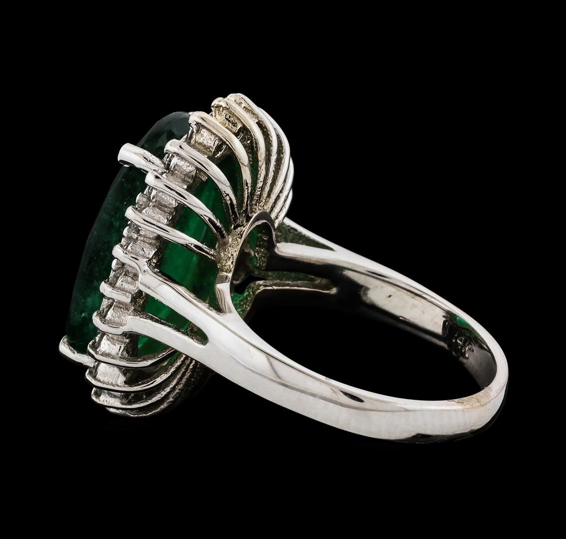 One electronically tested 14KT white gold lady's cast fashion ring with a split shank basket halo with a bright polish finish. The featured lady's ring has a shank measuring 2.56 millimeters wide. Identified with markings of '14K'. Condition is new, good workmanship. Containing: One prong set oval modified mixed cut natural emerald, measuring 16.60 x 12.91 x 4.60mm, (depth est.) 25%. bulge factor, approximate weight of 7.21ct., clarity is heavily included, medium dark, moderately strong, green color, (GIA G 6/4), cut is good. Transmitting light somewhat diffusely, semi-transparent to translucent. Naturally occurring internal & external characteristics are present. Indications of oil residue. Colored gemstones are presumed to have been subjected to commonly used enhancement processes. Graded in the setting. Twenty-Four prong set round brilliant cut diamonds, measuring 2.00 - 1.90 x 1.17mm (depth est.) approximate total weight of 24 Stones = 0.65ct. Graded in the setting. Clarity SI-1 to SI-2. Color: G - H Cut Good. Total Weight of Colored Stones 7.21ct.. Total Weight of Diamonds 0.65ct.. Total Weight of Ring 7.80gm GAS Appraised at $10,285.00.