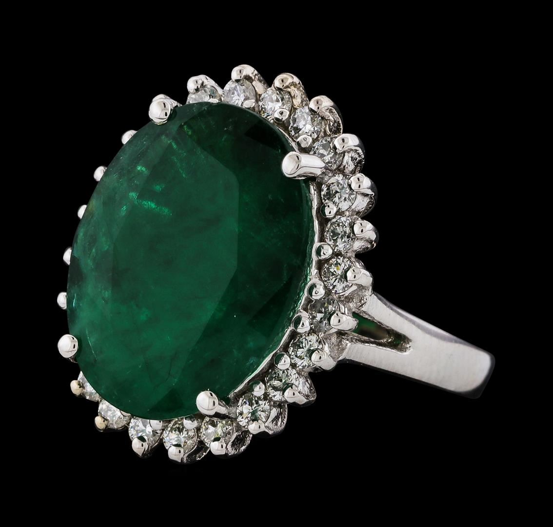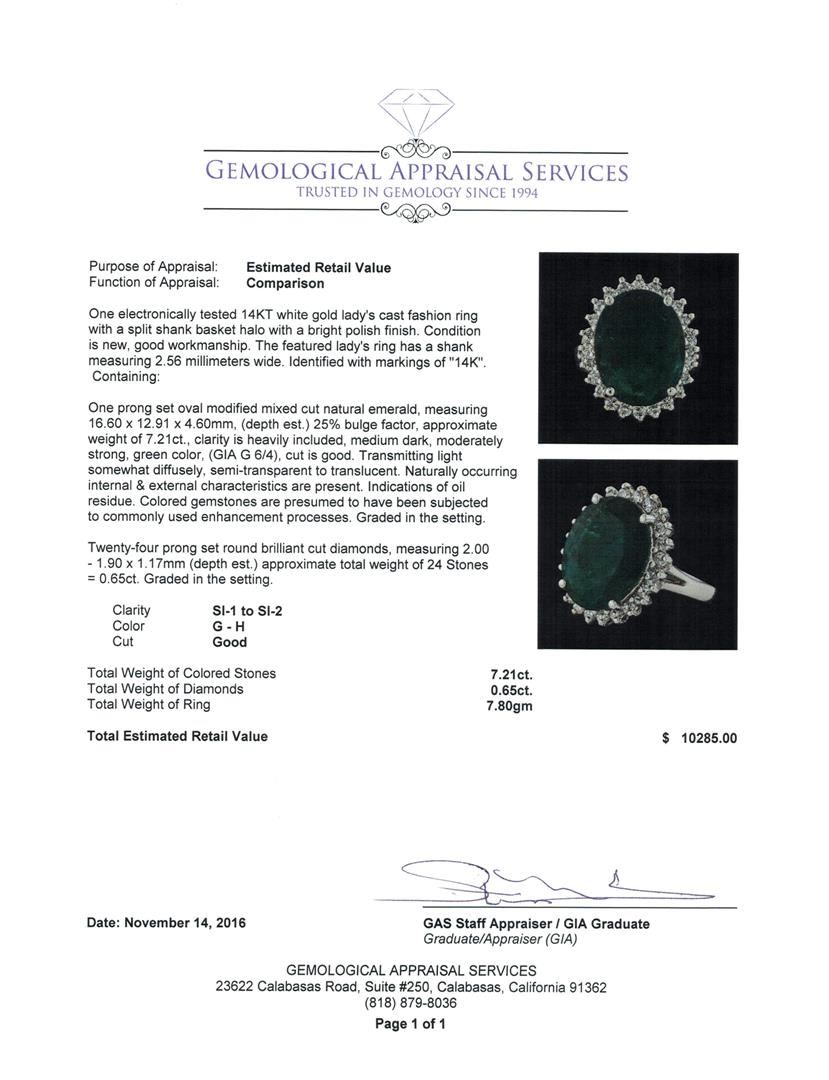 One electronically tested 14KT white gold lady's cast fashion ring with a split shank basket halo with a bright polish finish. The featured lady's ring has a shank measuring 2.56 millimeters wide. Identified with markings of '14K'. Condition is new, good workmanship. Containing: One prong set oval modified mixed cut natural emerald, measuring 16.60 x 12.91 x 4.60mm, (depth est.) 25%. bulge factor, approximate weight of 7.21ct., clarity is heavily included, medium dark, moderately strong, green color, (GIA G 6/4), cut is good. Transmitting light somewhat diffusely, semi-transparent to translucent. Naturally occurring internal & external characteristics are present. Indications of oil residue. Colored gemstones are presumed to have been subjected to commonly used enhancement processes. Graded in the setting. Twenty-Four prong set round brilliant cut diamonds, measuring 2.00 - 1.90 x 1.17mm (depth est.) approximate total weight of 24 Stones = 0.65ct. Graded in the setting. Clarity SI-1 to SI-2. Color: G - H Cut Good. Total Weight of Colored Stones 7.21ct.. Total Weight of Diamonds 0.65ct.. Total Weight of Ring 7.80gm GAS Appraised at $10,285.00.