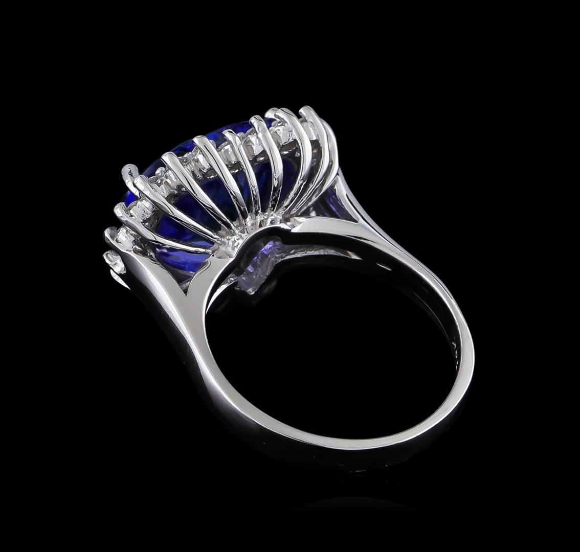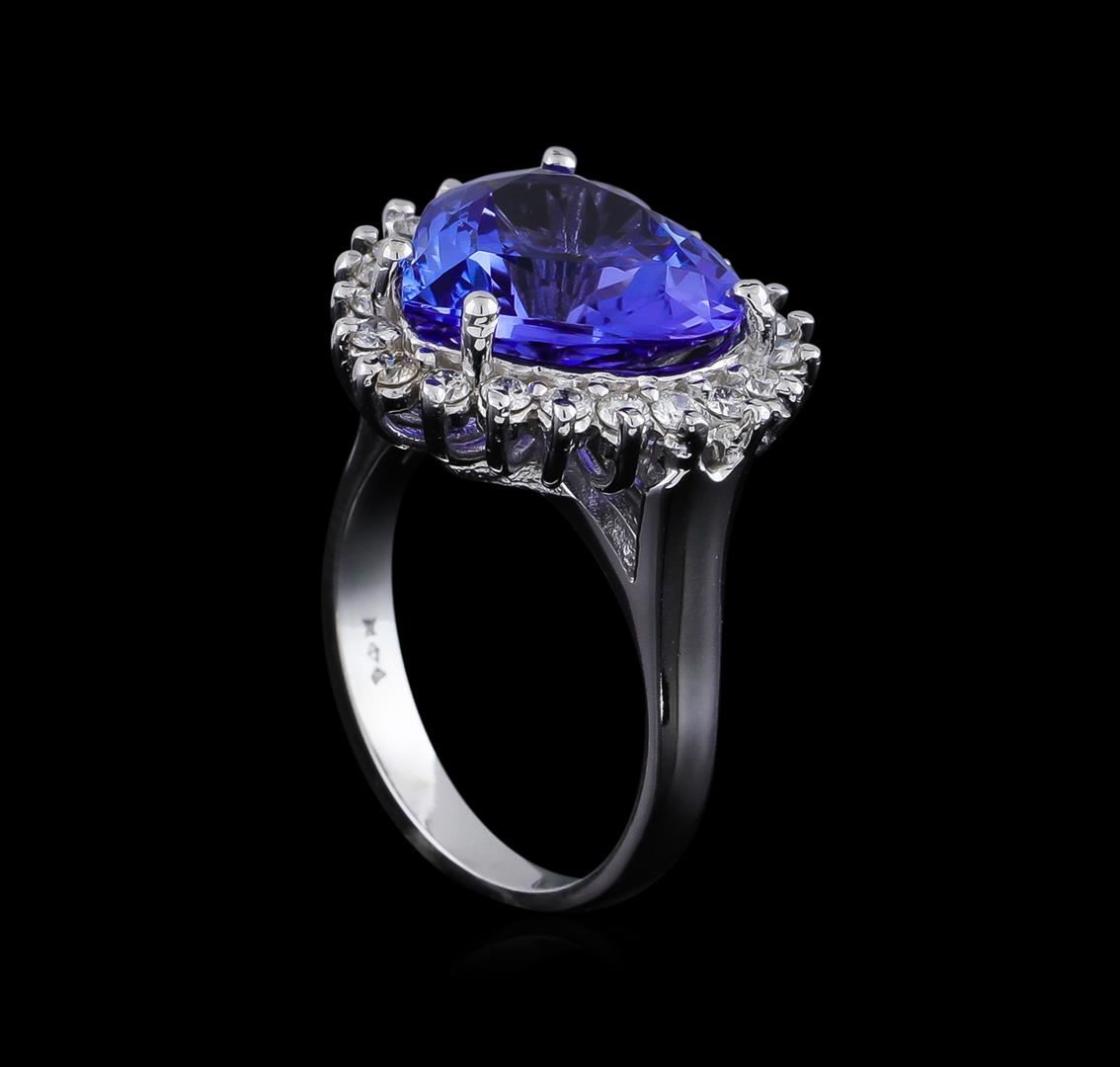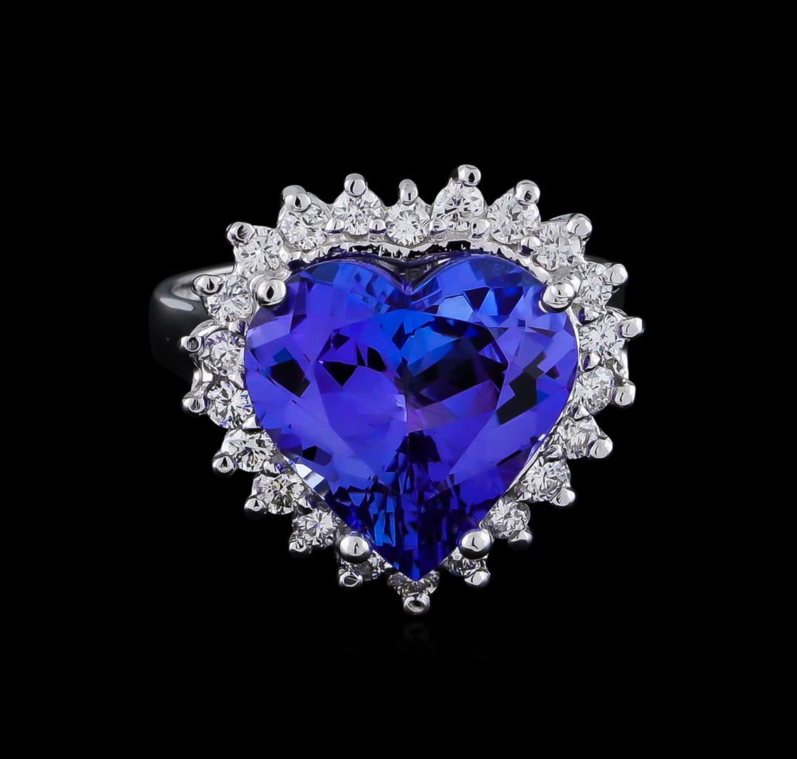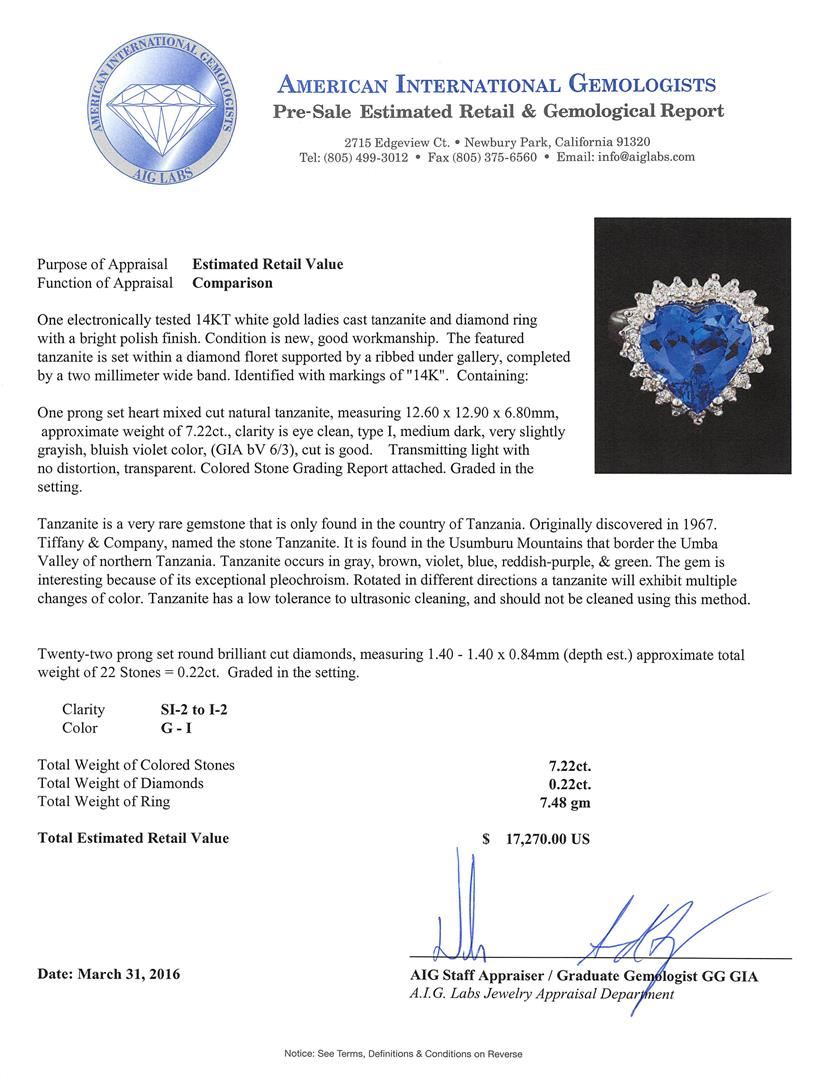 One electronically tested 14KT white gold ladies cast tanzanite and diamond ring with a bright polish finish. The featured tanzanite is set within a diamond floret supported by a ribbed under gallery, completed by a two millimeter wide band. Identified with markings of "14K". Condition is new, good workmanship. Containing: One prong set heart mixed cut natural tanzanite, measuring 12.60 x 12.90 x 6.80mm, approximate weight of 7.22ct., clarity is eye clean, type I, medium dark, very slightly grayish, bluish violet color, (GIA bV 6/3), cut is good. Transmitting light with no distortion, transparent. Colored Stone Grading Report attached. Graded in the setting. Tanzanite is a very rare gemstone that is only found in the country of Tanzania. Originally discovered in 1967. Tiffany & Company, named the stone Tanzanite. It is found in the Usumburu Mountains that border the Umba Valley of northern Tanzania. Tanzanite occurs in gray, brown, violet, blue, reddish-purple, & green. The gem is interesting because of its exceptional pleochroism. Rotated in different directions a tanzanite will exhibit multiple changes of color. Tanzanite has a low tolerance to ultrasonic cleaning, and should not be cleaned using this method. Twenty-Two prong set round brilliant cut diamonds, measuring 1.40 - 1.40 x 0.84mm (depth est.) approximate total weight of 22 Stones = 0.22ct. Graded in the setting. Clarity: SI-2 to I-2. Color: G - I. Total Weight of Colored Stones 7.22ct. Total Weight of Diamonds 0.22ct. Total Weight of Ring 7.48gm. AIG Appraised at $17,270.00.