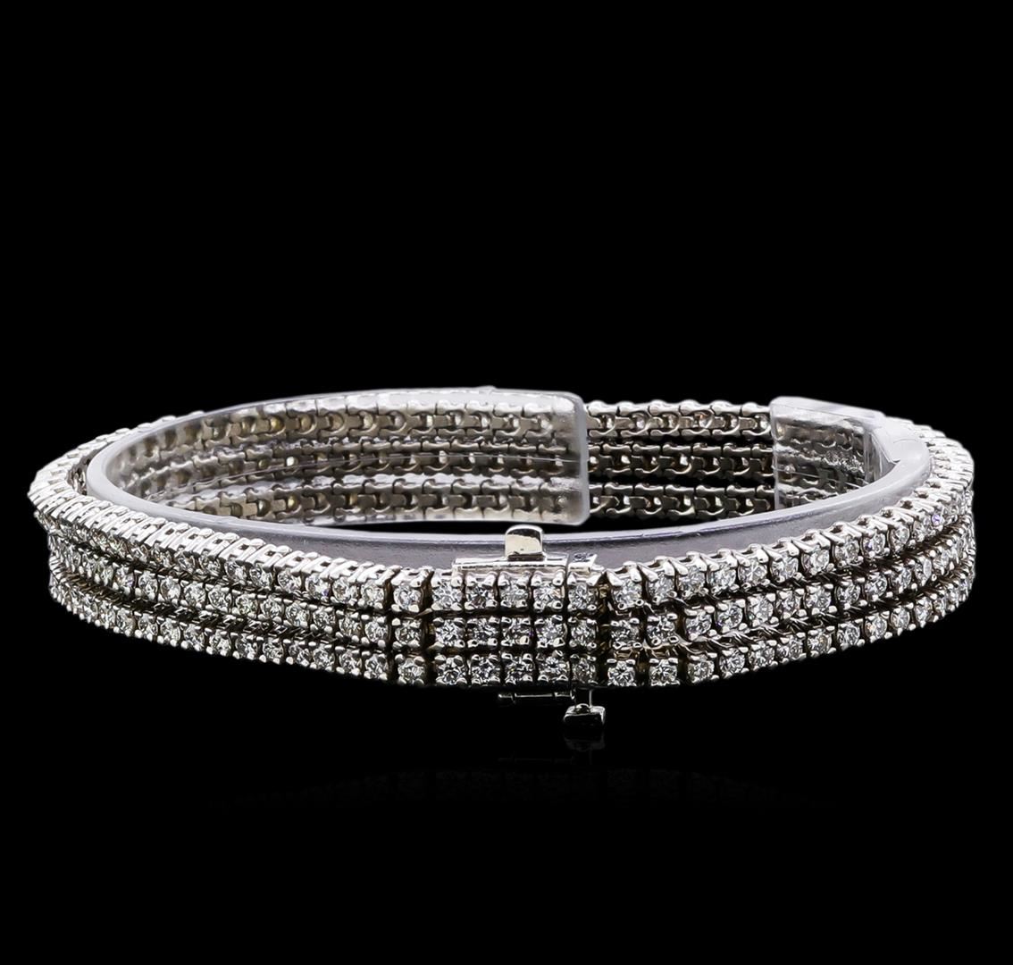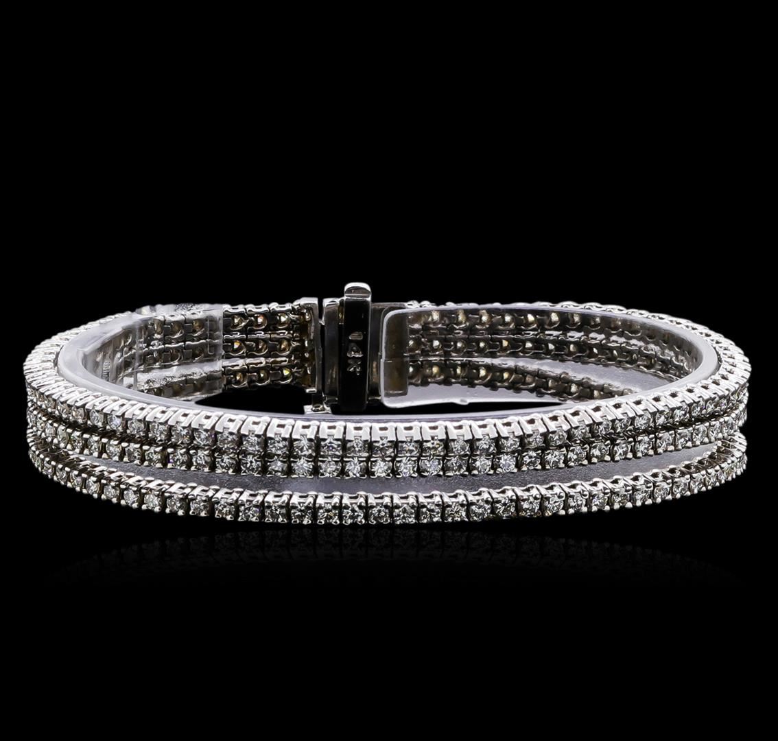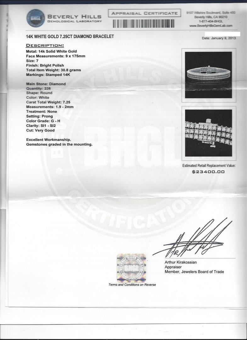 One 14KT white gold 7.25ctw diamond bracelet. Metal: 14KT solid white gold. Face Measurements: 9 x 175mm. Size: 7. Finish: Bright polish. Total Item Weight: 30.8 grams. Markings: Stamped 14K. Containing: 225 round diamonds with a total weight of 7.25ct. Measuring: 1.9 - 2mm. Treatment: None. Setting: Prong. Color Grades: G - H. Clarity: SI1 - SI2. Cut: Very good. Excellent workmanship. Gemstones graded in the setting. BHGL Appraised at $23,400.00.