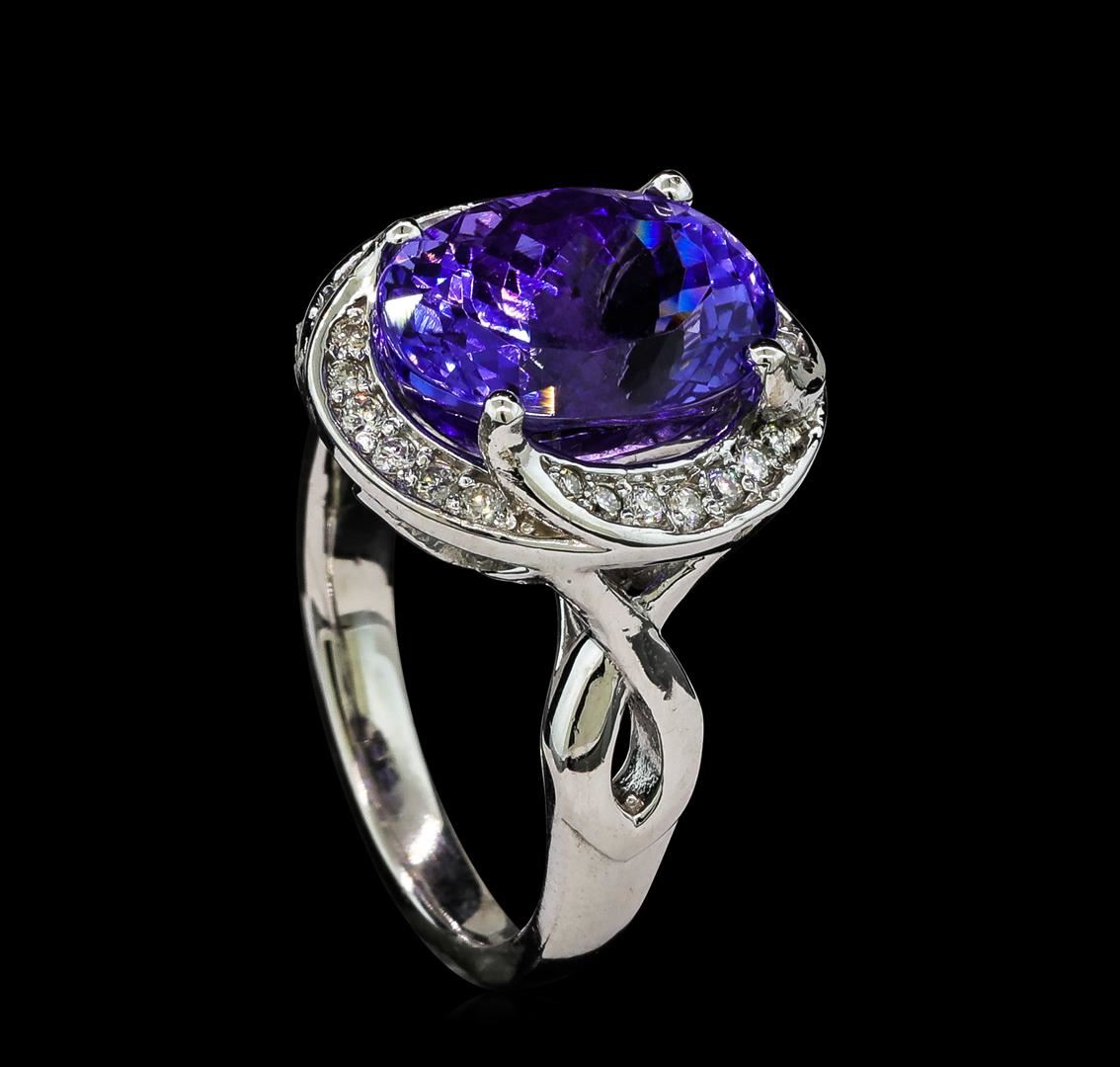 One electronically tested 14KT white gold lady's cast fashion ring with a crossover shank scalloped halo with a bright polish finish. The featured lady's ring has a shank measuring 2.69 millimeters wide. Identified with markings of '14K'. Condition is new, good workmanship. Containing: One prong set oval modified brilliant cut natural tanzanite, measuring 13.10 x 9.52 x 8.10mm, (depth est.) 3%. bulge factor, approximate weight of 7.25ct., clarity is eye clean, medium, moderately strong, violetish blue color, (GIA vB 5/4), cut is very good. Transmitting light with no distortion, transparent. Colored gemstones are presumed to have been subjected to commonly used enhancement processes. Graded in the setting. Twenty-Six prong set round brilliant cut diamonds, measuring 1.50 - 1.40 x 0.90mm (depth est.) approximate total weight of 26 Stones = 0.30ct. Graded in the setting. Clarity SI-1 to SI-2. Color: H - I Cut Good. Total Weight of Colored Stones 7.25ct.. Total Weight of Diamonds 0.30ct.. Total Weight of Ring 8.30gm. GAS Appraised at $13,535.00.